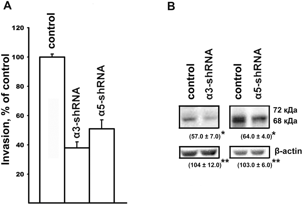 Along with resistance to anoikis, tumor progression is associated with an increase in the invasive activity of tumor cells. In this study, implication of α3β1 and α5β1 in the mechanisms of tumor cell invasion was evaluated by downregulating the receptors and looking at the effect on the in vitro invasion and levels of matrix metalloproteinases (MMPs) by the SK-Mel-147 cells. In a previous study, we showed that the suppression of α2β1 led to a 2-fold decrease in the in vitro invasion and a significant decrease in the activity of collagenases MMP-2 and MMP-9 in melanoma cells [19]. As can be seen from the data presented in Figure 2, blocking the expression of the α3β1 and α5β1 receptors was accompanied by a sharp decrease in the in vitro invasion and in the level of the active (68 kDa) form of collagenase MMP-2 in melanoma cells. Thus, as with the clonal activity, the three integrins differing in ligand specificity were found to have a stimulating effect on the in vitro invasion of melanoma cells. In contrast with the results presented in the cited article [19], collagenase MMP-9 and the inactive (72 kDa) form of MMP-2 were not found in this study. This was likely due to the use of cell cultures differing in the number of cell doublings.