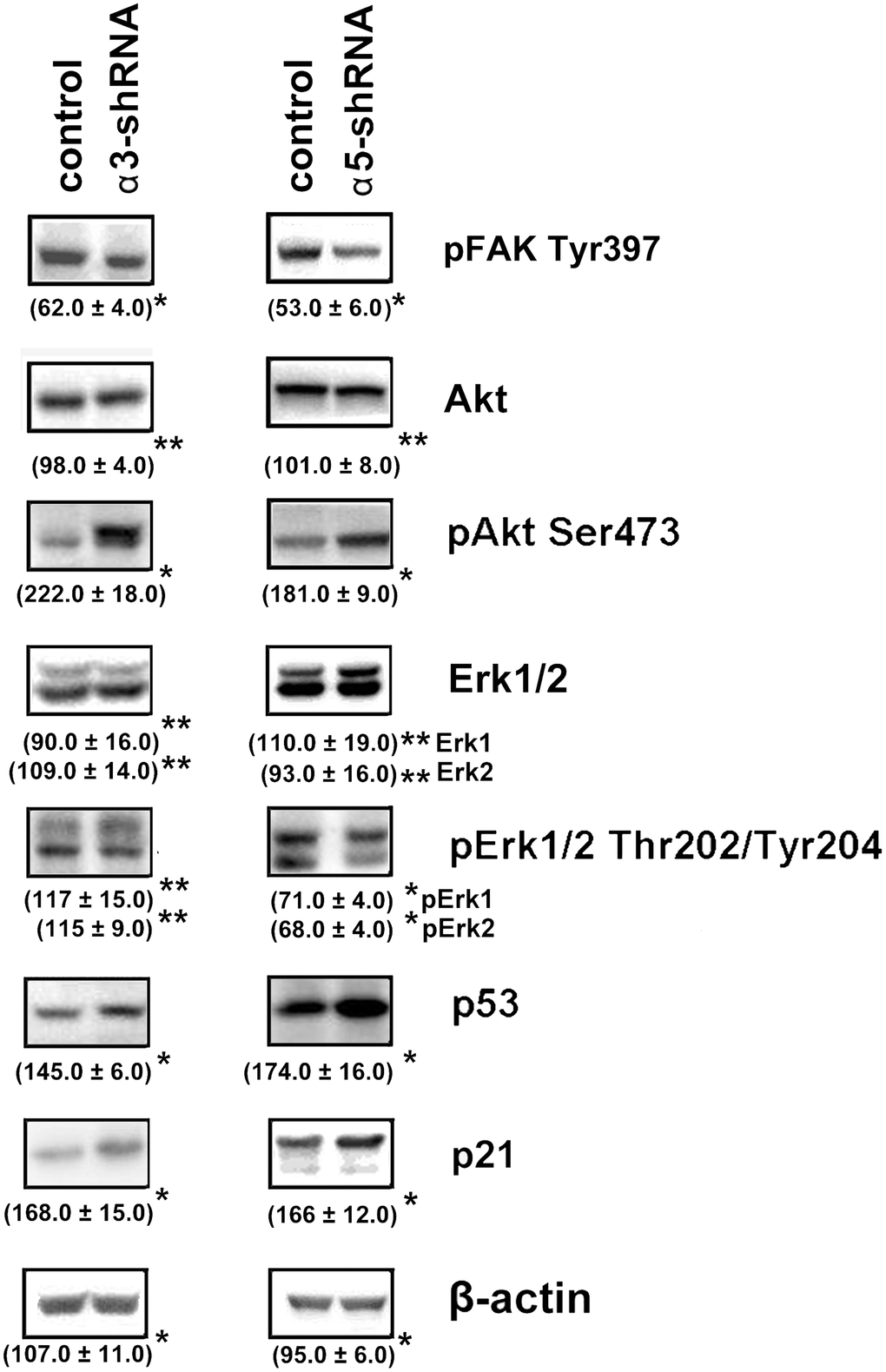 To clarify the mechanisms underlying the impact of α3β1 and α5β1 on tumor phenotype, we analyzed the expression of the signaling proteins that have been implicated in regulating various physiological functions of cells. A western blot analysis of cell protein lysates showed that blocking the expression of the two integrins led to a sharp increase in the levels of the apoptogenic protein p53 and the cell cycle inhibitor protein p21 (Figure 3). Many studies have demonstrated that these proteins inhibit tumor growth [24, 25]. The levels of p21 and p53 increased during suppression of invasion and stimulation of anoikis induced by downregulating α3β1 and α5β1, which indicated that p21 and p53 were involved in the signaling of these receptors. We also analyzed the levels of FAK, Erk, and Akt, which are other signaling proteins that play a role in integrin-dependent signaling. The activity of these enzymes was evaluated by determining the levels of their phosphorylated (active) forms in the cell lysates. As can be seen from Figure 3, the suppression of each of the receptors was accompanied by significantly reduced levels of FAK. FAK mediates the involvement of integrins in the signaling pathways, which determines the motility of the tumor cells, stimulates production of collagenases MMP-2 and MMP-9, and enhances the invasive activity [26]. Thus, a decrease in the level of the active form of FAK in cells with downregulated α3β1 and α5β1 receptors correlated with a reduction in the invasive activity of the cells and these results suggested that FAK was involved in signaling of both integrins. Figure 3 also shows that the suppression of α3β1 did not affect the levels of the total Erk kinase isomers (42 kDa and 44 kDa) and their phosphorylated forms in SK-Mel-147 cells. However, blocking α5β1 caused a noticeable decrease in the levels of the active forms, although it did not affect the content of the total protein. Erk is the final link in the Ras/Raf/MEK/Erk cascade that transfers integrin- or growth factor-initiated signals controlling cell proliferation, apoptosis, and cell senescence [27]. In a particular cell population, the choice of any of these responses depends on the intracellular localization of Erk and the strength of its signal (i.e., the level and duration of its active state) [28]. One would suggest that α3β1 and α5β1 differ in the strength of the Erk signal they induce in melanoma cells and α3β1 controls invasion and anoikis in these cells via Erk-independent pathways.