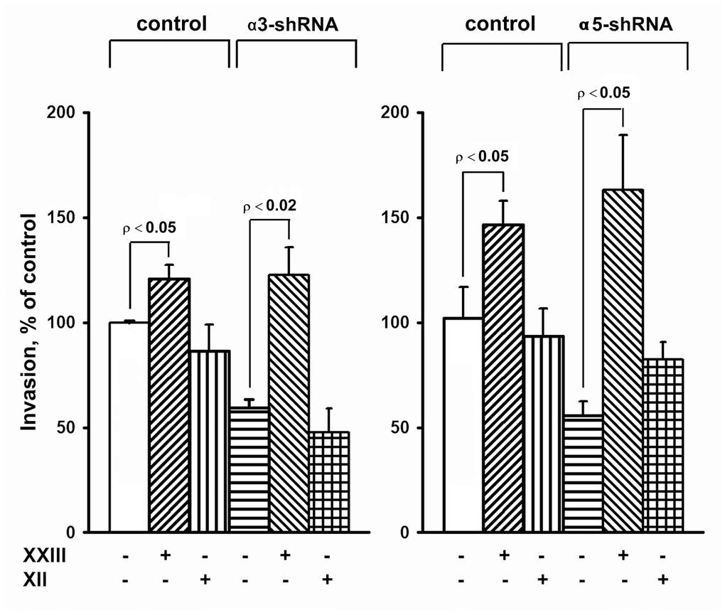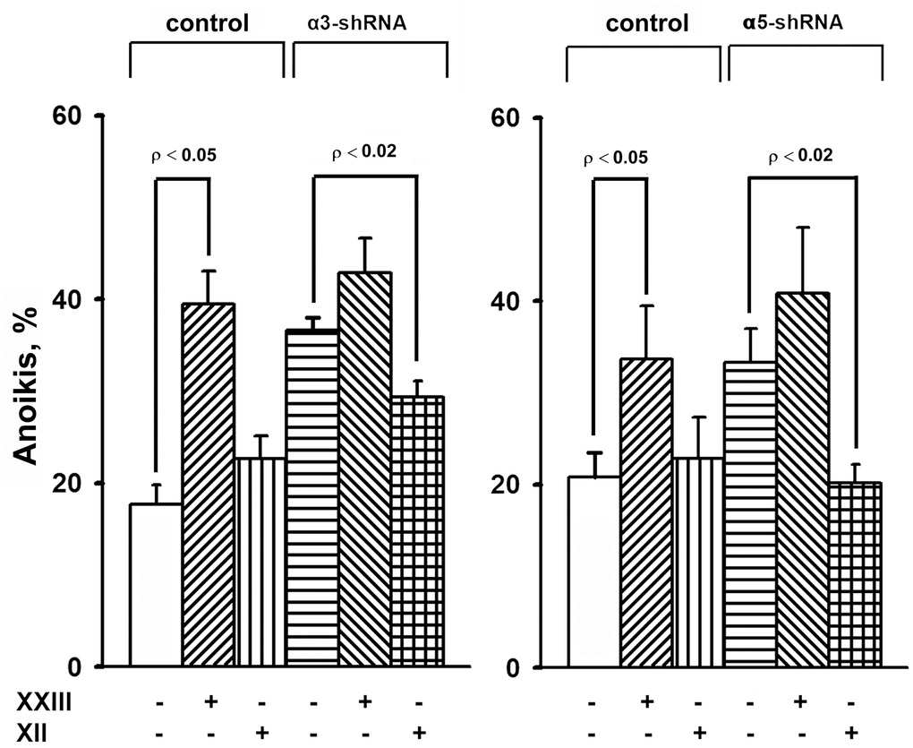 The data found in this study agreed with the results of other studies that used culture models of tumors with different origins. For example, one study found that the downregulation of α3β1 in breast carcinoma cells with high metastatic potency led to a decrease in their in vitro invasion and tumorigenic activity [13]. Another study found that mouse keratinocytes, expressing E7 oncoprotein acquired invasive properties only if α3β1 was expressed on the surface of the cells [14]. Sharp increases in the in vitro invasions of colon carcinoma and gastric cancer cells occurred upon activation of some transcription factors, was shown to be due to the increased expression of α5β1 [9]. The data found in this investigation, using melanoma cells, as well as the results of our previous studies on breast carcinoma cells [21] showed that the knock-down of α5β1 significantly reduced the invasive activity of the cells and suppressed the activity of collagenase MMP-2. Our results demonstrated the protective effect of α3β1 and α5β1 against anoikis in melanoma cells and were confirmed by studies on cells of various origins, such as gastric cancer cells [22], primary prostate epithelium cell cultures [23], and bone marrow stem cells [18].