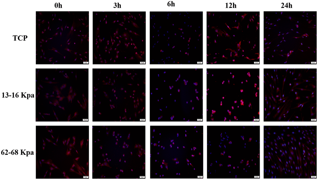 Since the expression position and amount of Piezo1 may be different at different time points, then immunofluorescence detection of Piezo1 at 0 h, 3h, 6h, 12h, 24h was performed. It was obvious that Piezo1 expression was highest at 12h on 13-16 kPa, and at 0 h on 62-68 kPa (Figure 10).