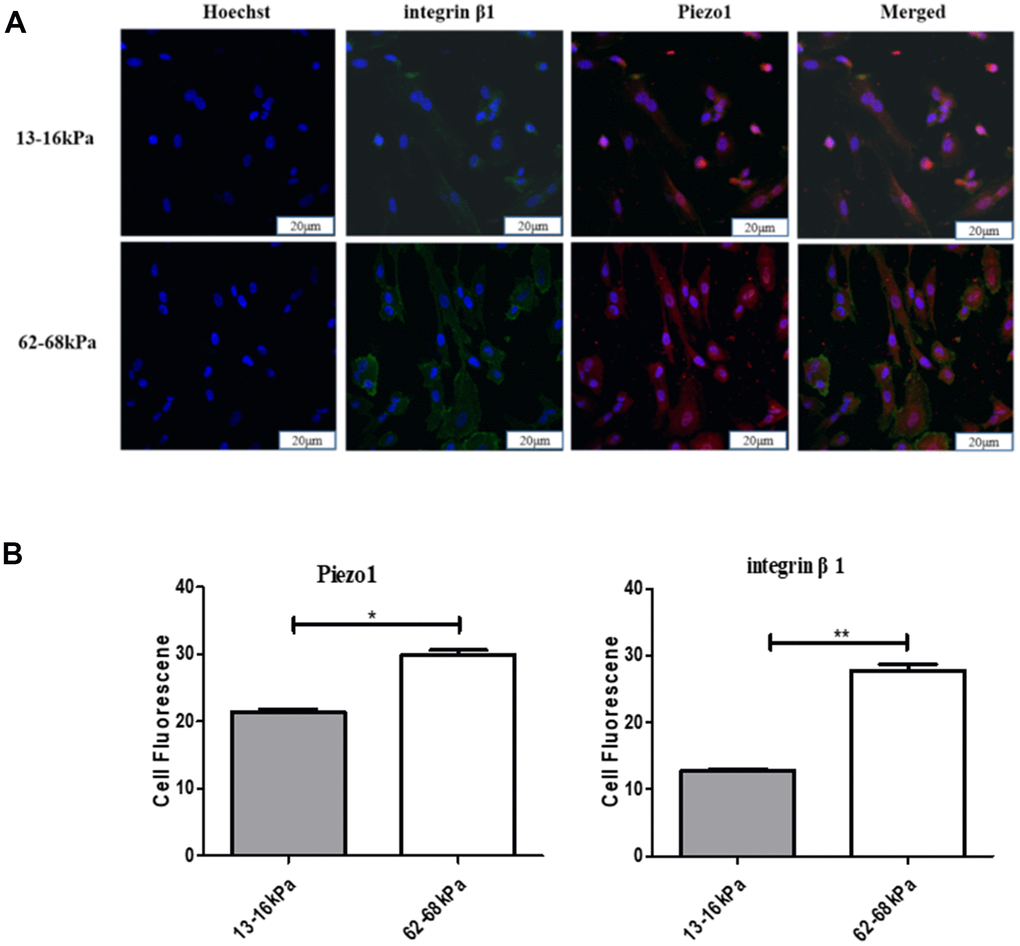 To explore the relationship between Piezo1 and integrin β1, we conducted co-stained immunofluorescence of them at 24 h on different matrix stiffness. The expression of both Piezo1 and integrin β1 increased with increasing stiffness. They were both highly expressed on 62-68 kPa and lowly expressed on 13-16 kPa (Figure 11A, 11B).