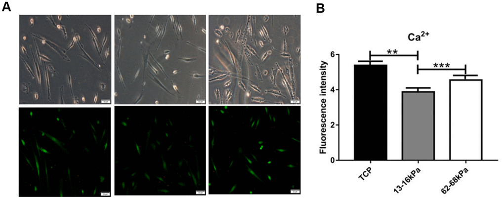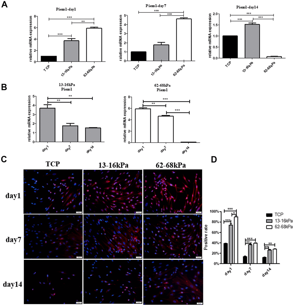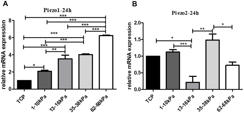 In this experiment, Piezo1 expression at 24 h was significantly higher than the 7th day and the 14th day. And Piezo1 expression on the 13-16kPa was lower than 62-68 kPa. On the 1st day, the expression of Piezo1 changed at different time points. Piezo1 is more sensitive to matrix stiffness within 24 h, hence 24 h was selected as the time point for research. Our study found that both the expression of integrin β1 and calcium ions on 13-16 kPa were lower than that on 62-68 kPa at 24 h, and there is a positive correlation between Piezo1 and matrix stiffness.