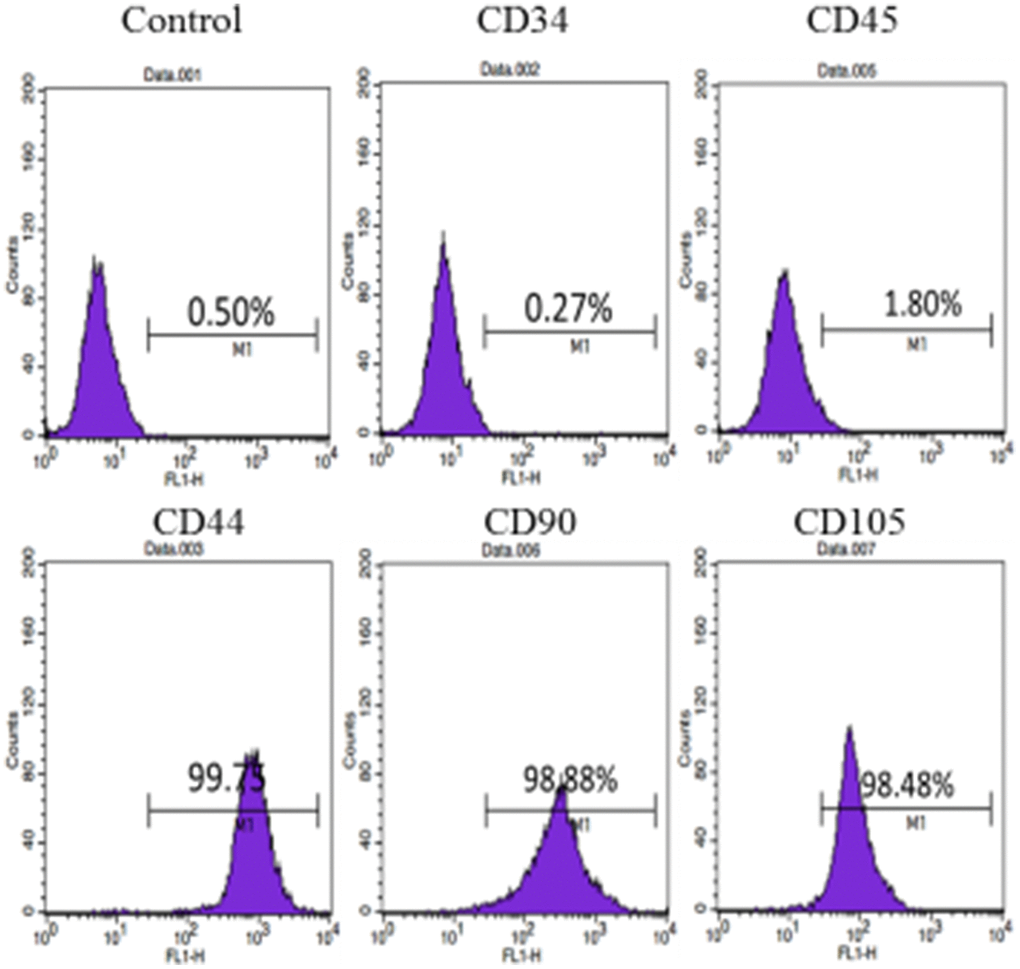 Flow cytometry were performed on the obtained cells. The cells expressed CD44, CD90 and CD105 positively, and expressed CD34 and CD45 negatively, indicating that the cells had the characteristics of mesenchymal stem cells (Figure 2).