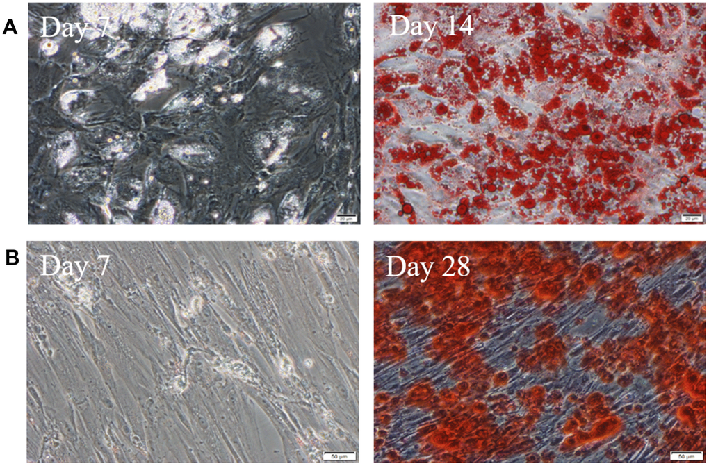 After 1 week of adipogenic induction, the shape of cells changed from spindle into column, and a few lipid droplets stained by Oil Red O emerged. After 2 weeks of adipogenic induction, the cells gradually became oval, and the cytoplasm was filled with vacuoles of oil droplets stained in red (Figure 3A). During osteogenesis induction, the cells gradually changed from spindle to polygon. After 4 weeks, there are bright red calcium nodules stained by alizarin red (Figure 3B).