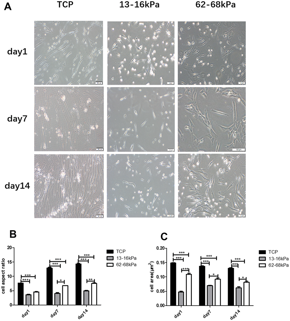 According to previous studies and experiments, we prepared PAAm hydrogels with different stiffness of 13-16 kPa and 62-68 kPa to imitate the stiffness of myocardium and fibrotic scar. hUC-MSCs were cultured on the different matrix gels for 1 day, 7 days and 14 days, whose morphology has changed significantly. Compared with the control group, more cells on 13-16kPa were shaped like round dots on the 1st day, and like short columnar cells on the 7th day. On the 14th day, the morphology of cells was like myocardial cells. Cells on 62-68 kPa were in the shape of polygon on the 1st day, and were in the shape of long spindle on the 7th day and the 14th day (Figure 4A). Then we measured the aspect ratio and area of the cells, which of cells on matrix of 13-16kPa were the lowest, and which of cells on matrix of 62-68kPa were the second lowest. The aspect ratio and area of control group cells were the largest (Figure 4B, 4C).