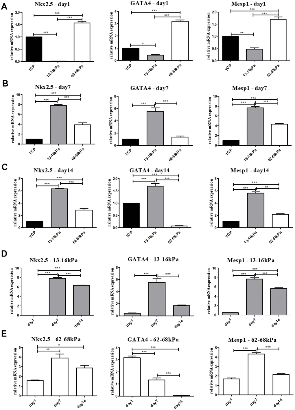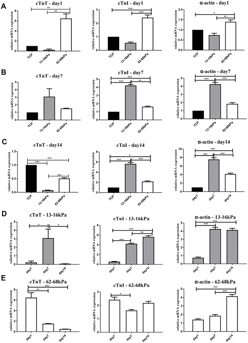 The mRNA expressions of early myocardial markers Nkx2.5, GATA4, Mesp1 and mature myocardial markers cTnT, cTnI, α-actin were detected by qRT-PCR. On the 1st day, the expression of early myocardial markers on 13-16 kPa were lower than 62-68 kPa, may because cells were more sensitive to the stiff matrix in a short time (Figure 5A). On the 7th day and the 14th day, cells grew stably on the matrix, and the expression of early myocardial markers on the 13-16 kPa matrix was highest among the three groups (Figure 5B, 5C). The expression of the three early myocardial markers on the same stiffness at different time points showed that the expression of Nkx2.5, GATA4 and Mesp1 on 13-16 kPa were the highest on the 7th day, followed by 14th day (Figure 5D). The condition of Nkx2 and Mesp1 on 62-68 kPa were like that on 13-16 kPa, whose highest expression emerged on the 7th day, while the expression of GATA4 decreased gradually over time (Figure 5E).