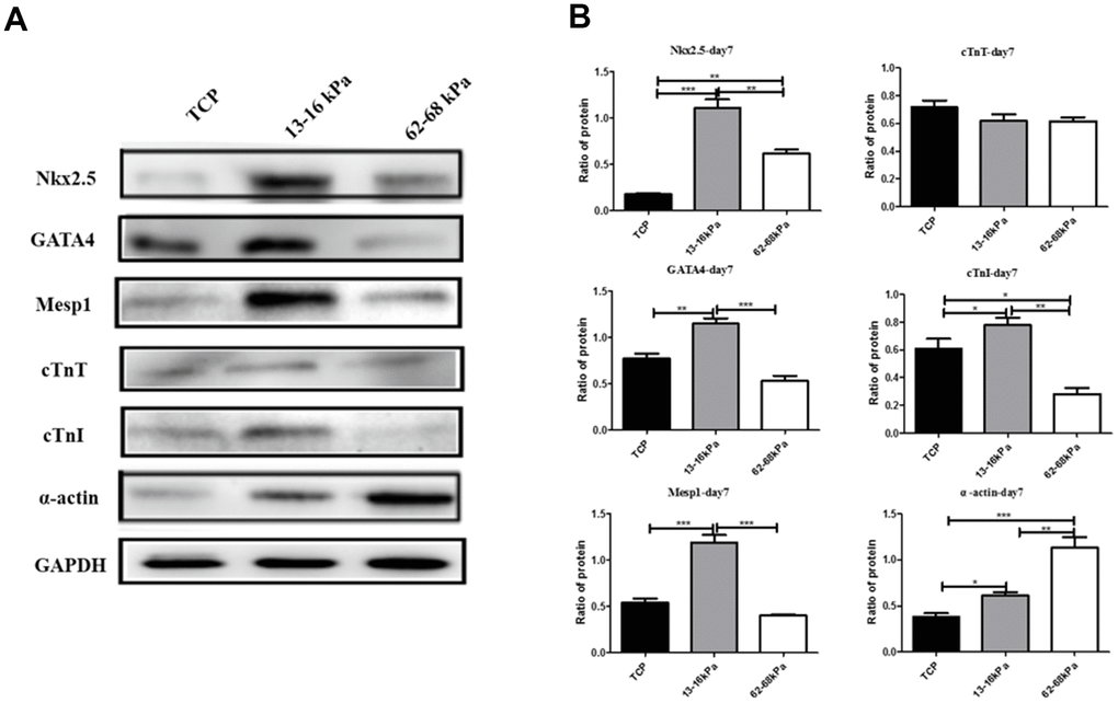 Western Blot was used to detect the protein levels of myocardial markers Nkx2.5, GATA4, Mesp1, cTnT, cTnI and alpha-actin. The total proteins of hUC-MSCs cultured on matrix with different stiffness were collected on the 7th day. Compared with the control group, Nkx2.5, GATA4, Mesp1, cTnT, cTnI and alpha-actin were all highly expressed on 13-16 kpa matrix. Compared with 62-68kpa, Nkx2.5, GATA4, Mesp1 and cTnI were all highly expressed on 13-16kpa matrix, which was consistent with qPCR results, further proving that hUC-MSCs tended to differentiate myocardium on 13-16kpa matrix (Figure 7A, 7B).