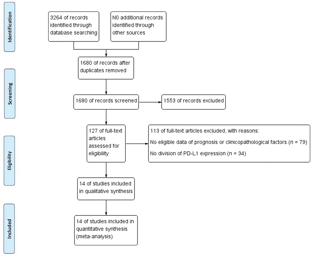 The literature retrieval process is displayed in Figure 1. A total of 3264 studies were acquired from the initial search. After duplicates were removed, 1680 articles were screened. After removal according to titles and abstracts, 127 studies remained. When assessing the full text, 79 articles were excluded for lacking data on prognosis or clinicopathological characteristics, and 34 studies were excluded for not distinguishing high and low PD-L1 expression. Ultimately, a total of 14 studies with 3133 patients published from 2009 to 2019 were included in the final analysis [19–23, 24–32]. Table 1 shows the baseline characteristics of all included studies. The assays used to detect PD-L1, evaluation methods and cutoff values are summarized in Supplementary Table 1. Among the final studies, 5 studies were included in the analysis of the effect of PD-L1 expression or PD-L1 DNA methylation (mPD-L1) on BCR-FS, and studies ranged from 1 to 10 in the analysis of the relationship of PD-L1 and various clinicopathologic factors. The quality of all qualified studies was high with the NOS scores ranging from 6 to 7. More details are displayed in Tables 2, 3.