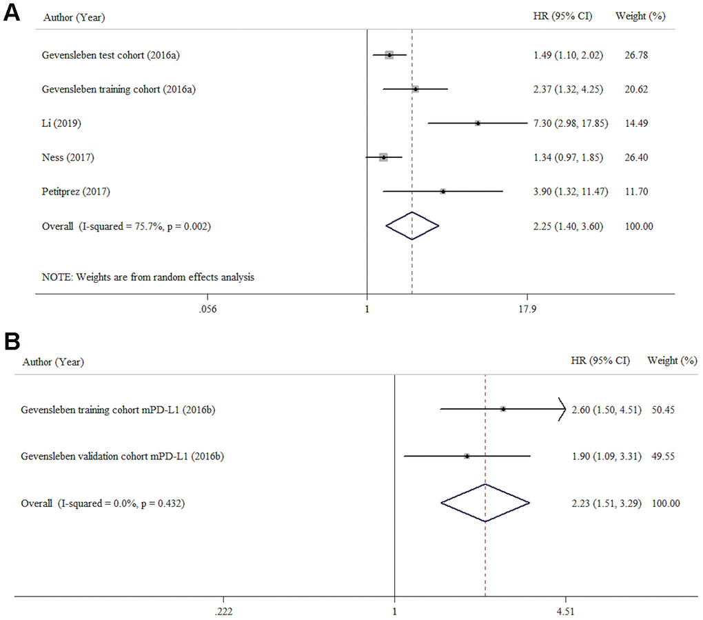 Figure 2. Forest plots HR for assessing the association between BCR-FS and PD-L1 protein expression (A) and mPD-L1 (B) in patients with prostate cancer.