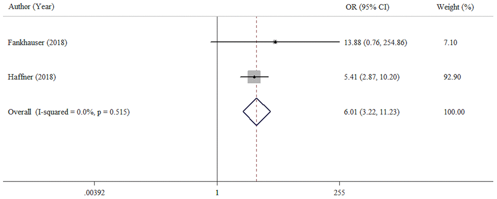 We explored the association of PD-L1 expression with sensitivity to androgen deprivation therapy (CRPC vs primary PCa). This analysis included two studies with 819 patients. Compared with primary PCa cases (hormone-sensitive prostate cancer, HSPC), CRPC cases had a high prevalence of high or positive PD-L1 expression (OR = 6.01, 95% CI = 3.22-11.23, p < 0.001) (Figure 3). No significant heterogeneity was found (I2 =0.0%, p = 0.520).