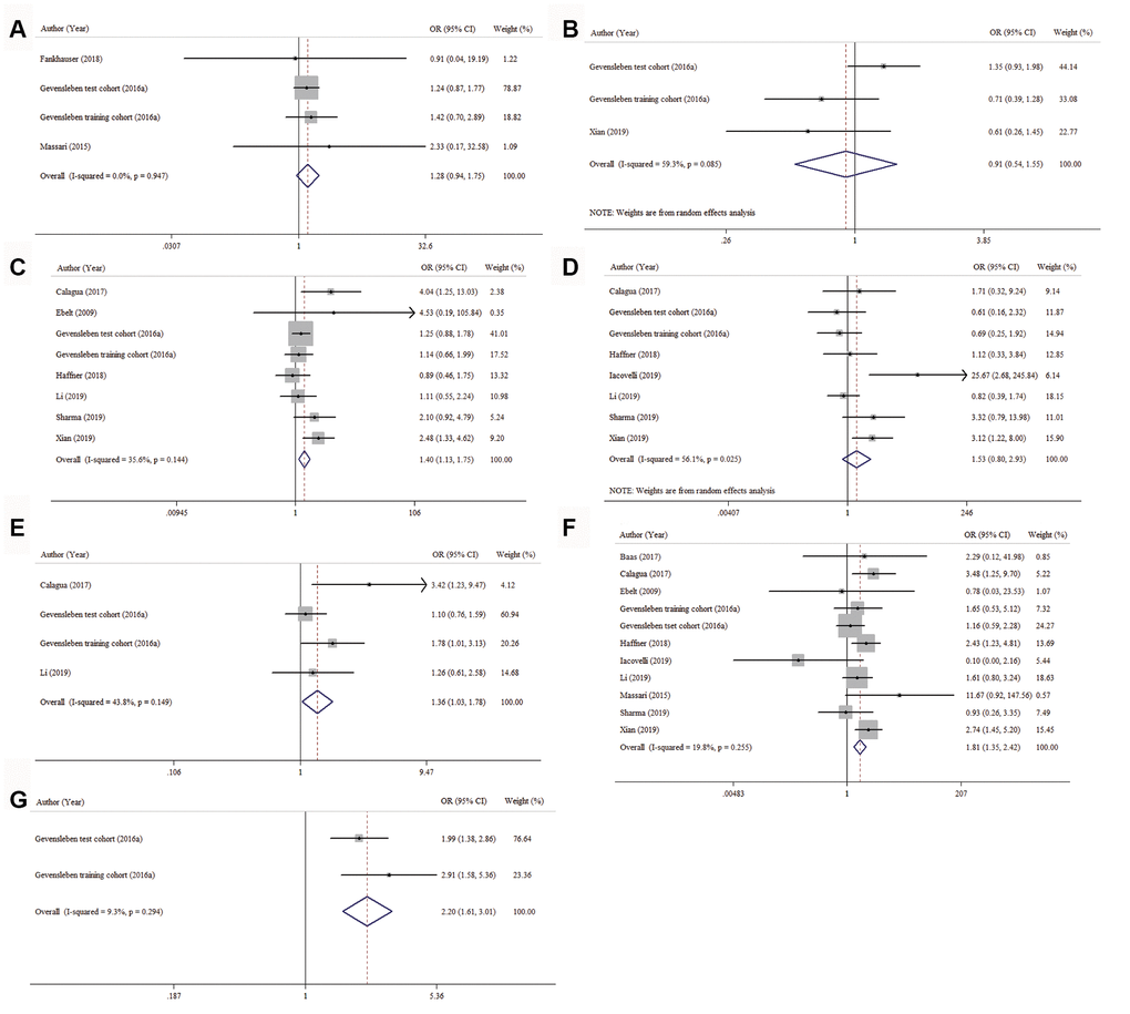 Figure 4. Forest plots for the correlation between PD-L1 expression and clinicopathologic characteristics. (A) age, (B) preoperative PSA, (C) tumor stage, (D) nodal status, (E) surgical margin, (F) Gleason score and (G) AR status.
