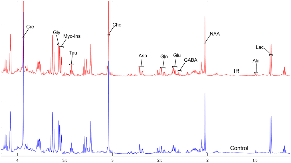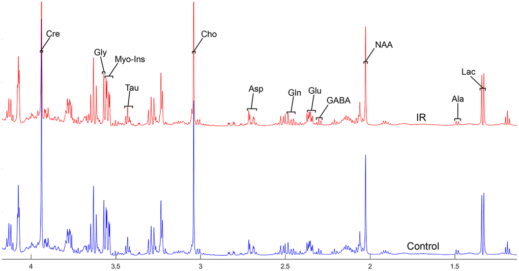 In order to precisely assess cerebral changes after myocardial IR injury, absolute concentrations of all related metabolites were calculated and compared (Supplementary Table 2 and Figure 5). The average difference in normalized PMRS spectra of selected metabolites between the Con and IR groups are displayed in Figures 1, 2, 3 and 4.