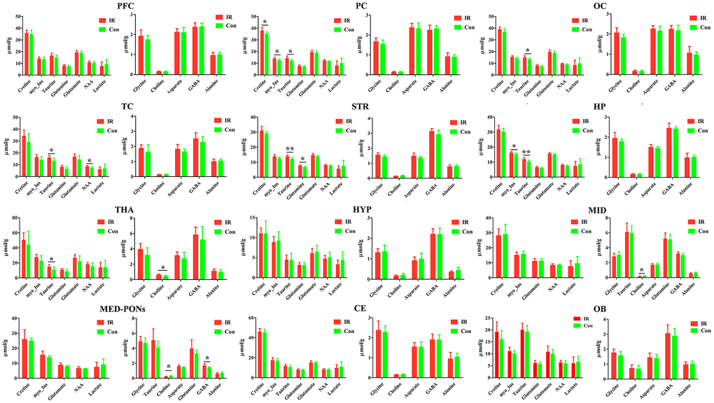We dissected 12 brain regions of two groups and employed PMRS spectra to examine the level of metabolites, including Cretine, Glycine, myo_Insitol, Taurine, Choline, Asparate, Glutamine, Glutamate, GABA, NAA, Alanine, and Lactate (Table 1 and Supplementary Table 2). We found that the level of metabolites was comparable across almost all different brain regions studied, including PC, OC, TC, MID, MED-PONs, STR, HP, and THA, except for PFC, OB, CE, and HYP (Table 1 and Supplementary Table 2). Interestingly, the PC, OC, TC, STR, HP, and THA in the IR group showed a higher level of Taurine compared to the Con group, whereas the level of Taurine in the other brain regions examined (including MID, MED-PONs) was not different between the IR group and Con group.