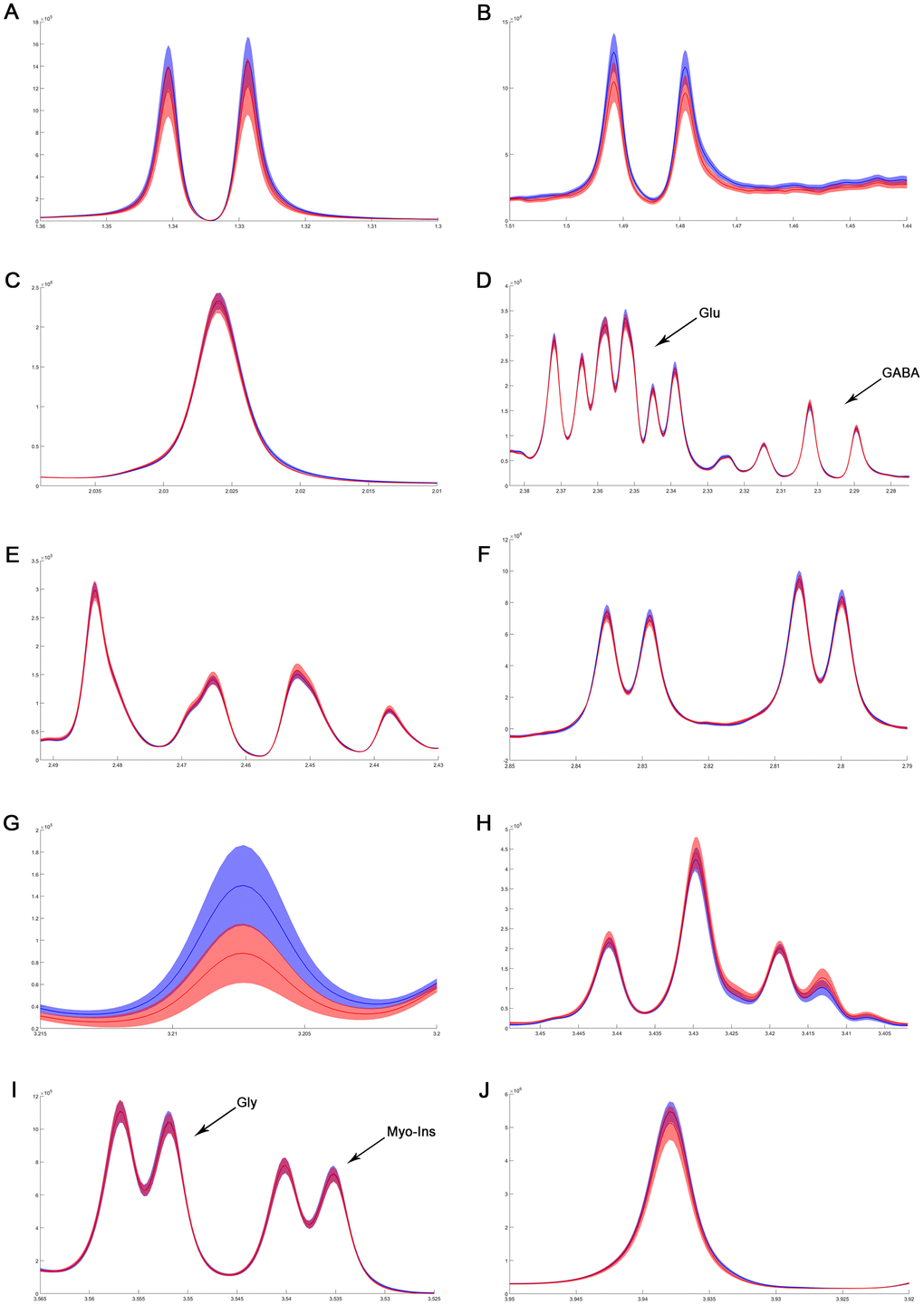 | Note: The data were compared with control group. “↑”and “↓” indicates increase and decrease, respectively. Statistical analysis was performed by the Mann-Whitney test and P < 0.05 was considered significant difference. Cho, choline; GABA, gamma-aminobutyric acid; Myo-Ins, Myo- inositol; Tau, taurine; Gln, glutamine; Cre, creatinine; NAA, N-acetylaspartate; Gly, glycine. | |||||||||||||||||||||||||||||||||||||||||||||||||||||||||||||||||||||||||||||||||||||||||||||||||||
