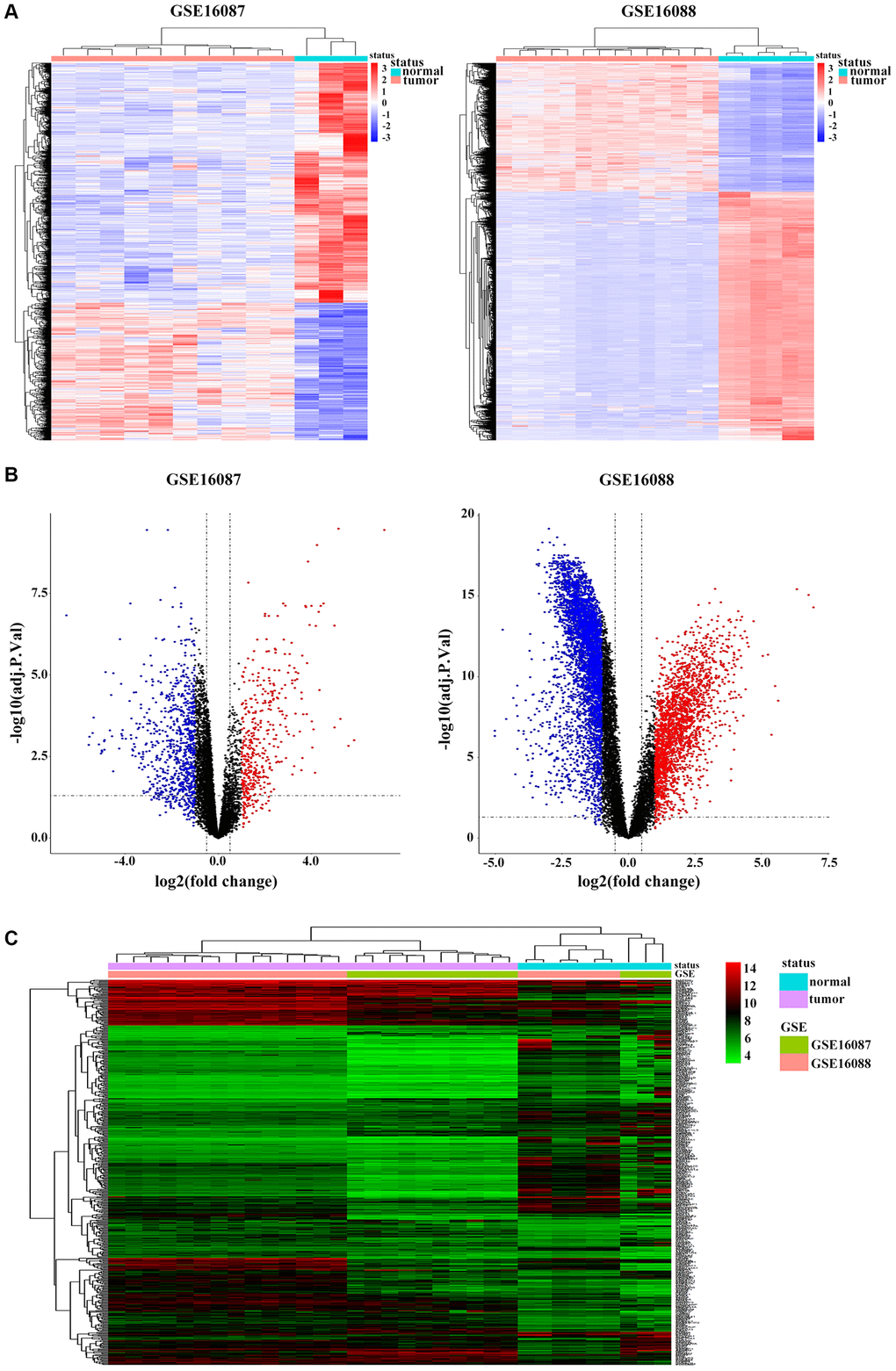 Three datasets of GSE16087, GSE16088 and GSE16091 [38] from the Gene Expression Omnibus (GEO) database were selected to analyze the differentially expressed genes (DEGs). The datasets for GSE16087 and GSE16088 respectively include 10 canine model of OS samples and 14 human OS samples, and also 6 normal tissue samples. GSE16091 consists of 34 human OS samples. The original. CEL files were downloaded and then were performed quality control and normalization for the matrix data of each GEO dataset as previously described [39]. DEGs of GSE16087 and GSE16088 or the overlap region were screened when |log2FoldChange (FC)| > 1 and adjusted P-value < 0.05. Clustering analyses were performed to show expression patterns of the DEGs in tumor and normal tissues.