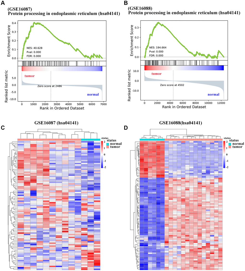 In this study, we focused on the potential oncogenes and tumor suppressors with prognostic values of OS. DEGs between the OS tumor and normal tissues across two GEO datasets were statistically analyzed. Hierarchical clustering analysis of the overlapping DEGs indicated that these genes enable to reflect the difference of tumor tissues against normal tissues. The results of GO and KEGG pathway enrichment analyses paid our attention to the biologically functional term of cell adhesion molecule binding and the protein processing in endoplasmic reticulum (ER) pathway. Shared DEGs in these two processes were obtained and further PPI analysis highlighted HSPA5, an oncogenic marker of great concern in OS-related research up to now. Its encoding protein glucose-regulated protein 78 (GRP78), a cell-protective ER chaperone protein, is one of the most promising anticancer targets for OS [19]. ER stress plays a significant role in allowing cells to survive when met the conditions that would normally trigger cell death. Specifically, aberrant expression of GRP78, the master regulator of the unfolded protein response (UPR), has been demonstrated to induce chemoresistance and serve as an indicator for poor prognosis in patients [26]. Overexpression of GRP78 has also been considered a predictor for aggressive behavior and poor prognosis in cancer, which was possibly involved in pathogenesis, growth, invasion and metastasis [27].
