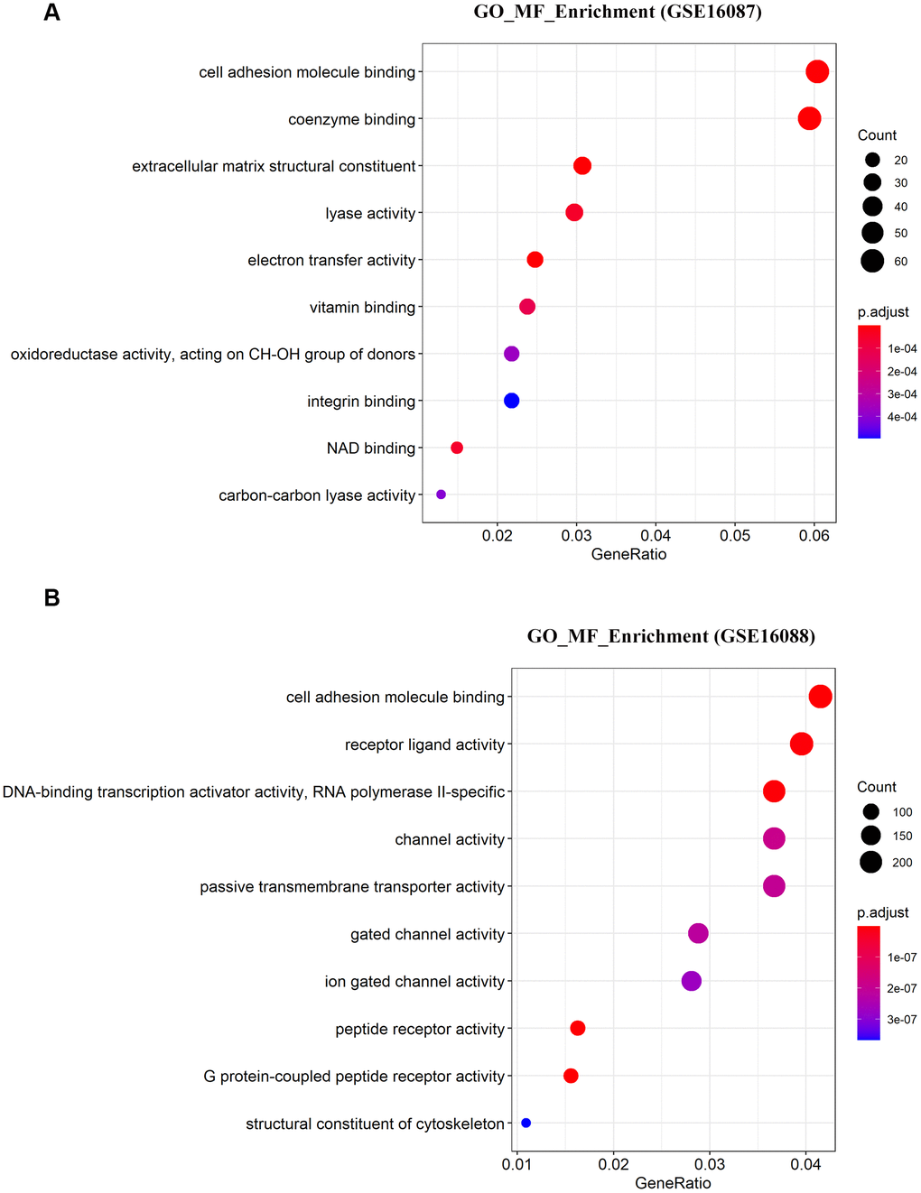 To determine the enriched gene sets among the DEGs, KEGG pathway analysis and GO functional analysis were run on the GSEAPY wrapper. KEGG pathway enrichment analysis exhibited that the DEGs in GSE16087 were mainly associated with protein processing in endoplasmic reticulum (ER), PI3K-Akt signaling pathway, MAPK signaling pathway and pathways in cancer. Proteasome, oxidative phosphorylation, DNA replication as well as the protein processing in ER were significantly enriched in GSE16088 (Figure 2A, 2B; Supplementary Figure 1B, 1C). The core group protein processing in ER (hsa04141) with 89 shared DEGs, were visualized by hierarchical clustering (Figure 2C, 2D). GO molecular function prediction demonstrated that the DEGs in both two datasets were primarily enriched in the process of cell adhesion molecule binding (Figure 3A, 3B). Furthermore, we gained 38 overlapping DEGs in the cell adhesion molecule binding term from the above mentioned two GSE datasets, and the biological network of GO categories was achieved by BiNGO analysis. Results showed that protein binding was statistically overrepresented in this set of genes (Supplementary Figure 2A). The PPI network complex of the overlapping DEGs was performed in the online database STRING to discover protein functions (Supplementary Figure 2B). We focused on HSPA5, an important ER molecular chaperone in the network. Given the vital functions of HSPA5-encoding chaperone protein GRP78 implicated in the poor prognosis of OS and the lack knowledge of its relationship with tumor suppressor ANXA1 [9, 11], it prompted us to address the underlying relevance between these two important biomarkers in OS. Moreover, the shared DEGs in the GO term of interest from the two GSE datasets were conducted for GO analysis. In consistence with the biological and PPI networks, both of the HSPA5 and ANXA1 were enriched in the process of cadherin binding and cell adhesion molecule binding (Supplementary Figure 2C), suggesting their potentially close correlation in molecular level.