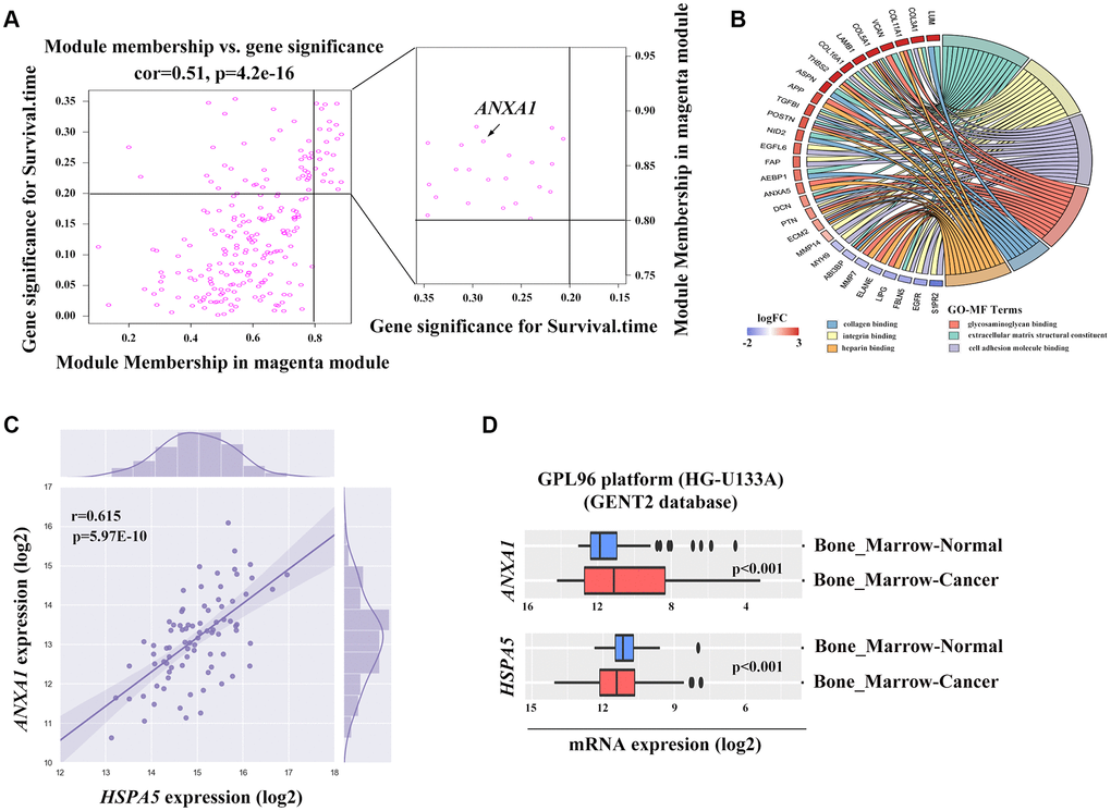 To find the clusters/modules containing highly correlated genes with similar expression pattern, we studied the OS samples with clinical traits using WGCNA [13–15]. Gene expression profiles were obtained from TARGET database. In all, 81 OS samples with survival data and metastatic status were included in WGCNA for subsequent analysis (Figure 4A). Here, β = 3 and R2 = 0.85 were recognized as the soft-thresholding for scale-free network (Figure 4B, 4C). The grey module was excluded using merged dynamic tree cut. As a result, we finally identified 31 gene co-expression modules (Figure 4D). The heatmap plotted the topological overlap matrix (TOM) among 1000 genes randomly selected, indicating there were independent variables between the models (Figure 4E). Next, we found a key magenta module containing ANXA1 which was highly correlated with OS prognosis (R2 = 0.33, P = 0.004 with survival time; R2 = -0.23, P = 0.03 with survival status; Figure 4F). The scatter plots of the correlation between module membership (MM) and gene significance (GS) in the magenta module with survival time of OS patients (correlation = 0.51, P = 4.2e−16) further illustrated that ANXA1 was one of the genes within the limits of MM > 0.8 and GS > 0.2 (Figure 5A), suggesting that ANXA1 was a hub gene in the magenta module. Importantly, GO analysis further indicated that the co-occurrence genes associated with ANXA1 based on the topological overlap in WGCNA were mainly enriched in binding term, including cell adhesion molecule binding, which was in line with the results in GSE datasets (Figure 5B).