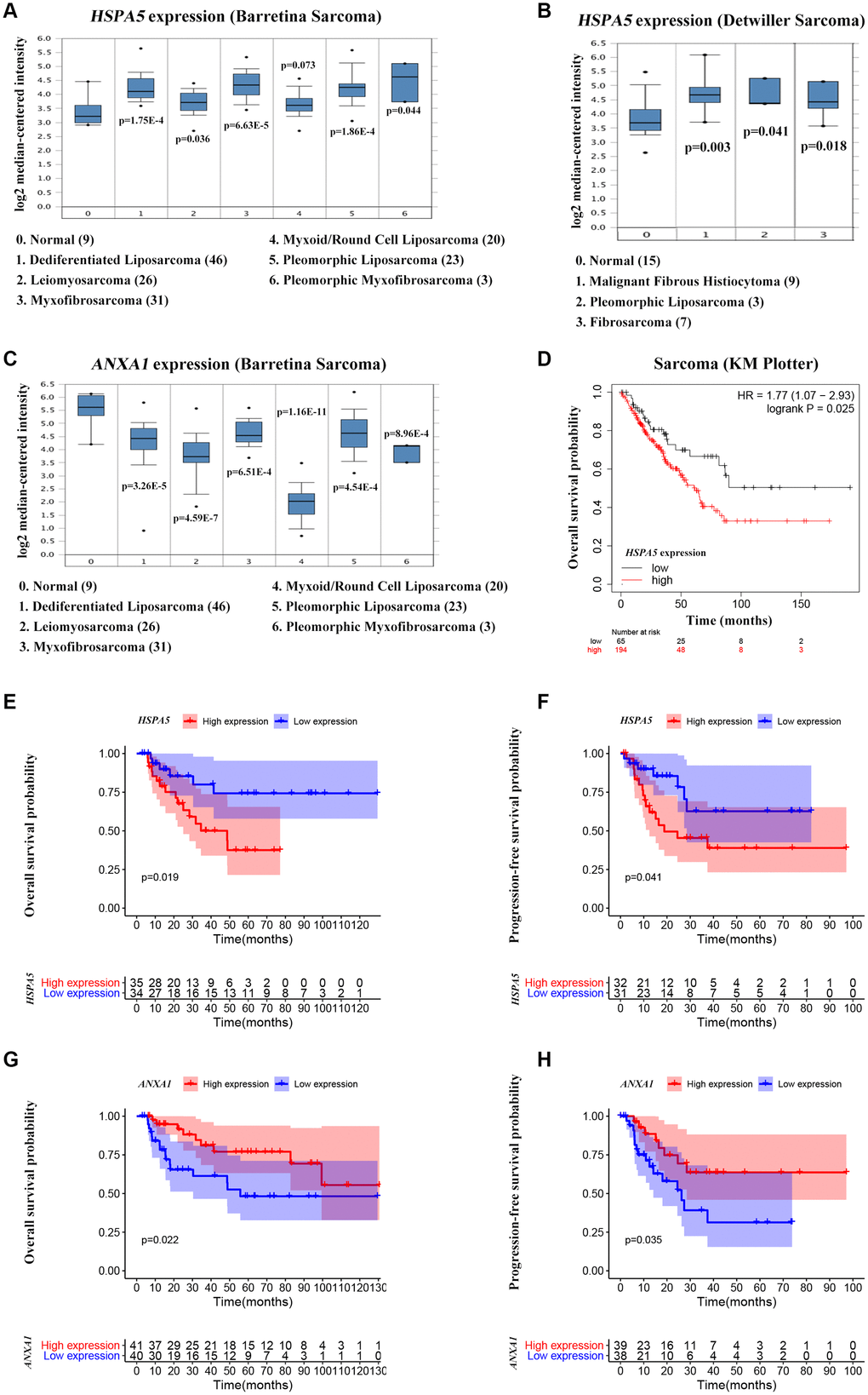 ANXA1 and HSPA5 were speculated to be intersect at multiple levels on the basis of above bioinformatic results. To address this possibility, we first assessed the correlation of expression levels between these two genes in OS patients in TARGET database. Unfavorably, the mRNA level of stress adaptive gene HSPA5 was statistically positively associated with the tumor suppressor gene ANXA1(Figure 5C). To further investigate the roles of ANXA1 and HSPA5 in the progression of OS, we analyzed their expressions in GENT2 database. Intriguingly, HSPA5 aberrantly expressed in bone-related cancer tissues compared with the normal tissues, whereas ANXA1 expression appeared to be downregulated in cancer (Figure 5D). The similar results were observed in sarcoma samples from ONCOMINE database (Figure 6A–6C), and online survival analysis revealed that abnormal HSPA5 expression resulted in significantly shorter survival time compared to that maintained in lower level (HR = 1.77, P = 0.025; Figure 6D). For further clinical survival evaluation, the expression level of HSPA5 and ANXA1 were introduced into the TARGET_OS clinical file. Kaplan-Meier survival analysis revealed that OS patients with high level of HSPA5 mRNA showed a remarkably lower overall survival rate and progression free survival rate. In contrast, and patients with higher ANXA1 mRNA level were inclined to live longer (Figure 6E–6H). Similar results were observed in GSE16091 dataset (Supplementary Figure 3A, 3B).