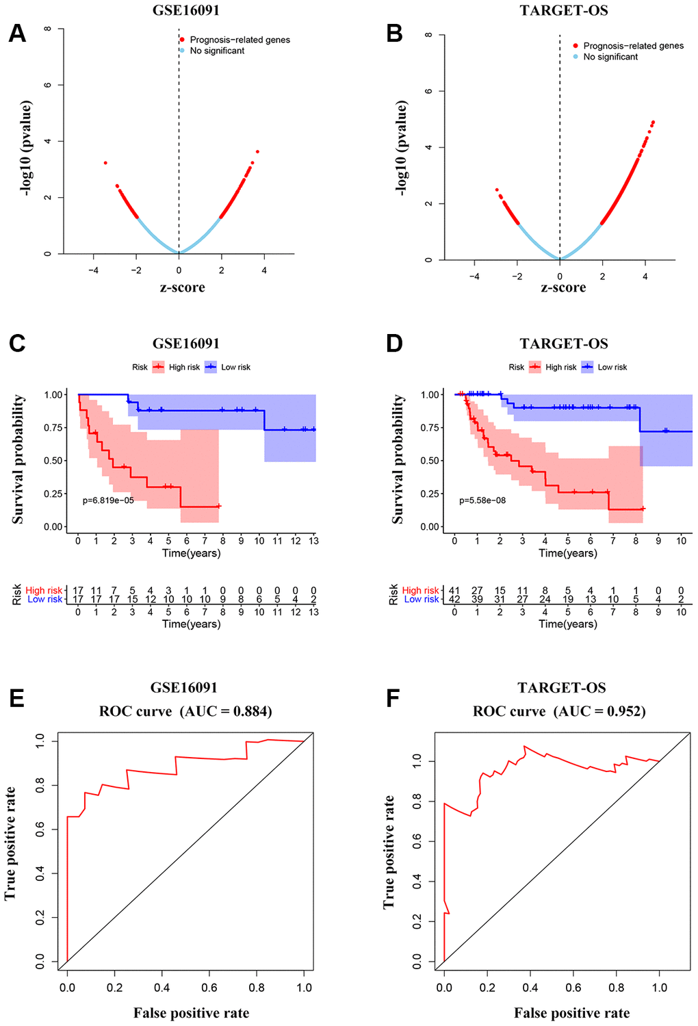 To further investigate the candidate genes for the prognosis of OS, we separately performed the univariable Cox regression analyses of datasets GSE16091 and TARGET_OS. In all, 273 and 3450 genes were identified to be prognostically relevant, respectively (Figure 7A, 7B). Next, a LASSO regression model [16] was exploited to select the pivotal prognostic genes. With the LASSO-penalized Cox regression models, the coefficients for the top-twenty features were calculated when Log λ = -3, and the partial likelihood deviances for the selected lambda were approximately 9 and 6 as shown in Supplementary Figure 4A, respectively in the two datasets. We found that patients with high-risk scores possessed a shorter survival time compared to those with low-risk scores in all subtypes evaluated in the GSE16091 dataset (Figure 7C). Similar results were observed in the TARGET_OS dataset (Figure 7D). In addition, receiver operating characteristic (ROC) curve analysis was performed to find the diagnostic significance of these integrated genes in OS. ROC curves of in GSE16091 and TARGET_OS were displayed in Figure 7E and 7F. For 5-year survival, the average area under the curves (AUCs) were respectively 0.884 and 0.952, which showed good sensitivity and specificity. Heatmap plotted the expression profiles of genes included in the Cox model based on the low-risk or high-risk classification (Figure 8A; Supplementary Figure 4B). These results demonstrate that these genes had the highest prognostic significances for OS.