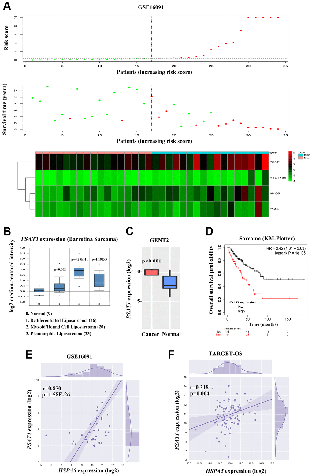 To further investigate the candidate genes for the diagnostic and prognostic effects of OS, we focused on one important predicted gene PSAT1 among the 4-gene significance obtained by Cox regression in GSE16091, an oncogene that plays a vital role in cancer progression and metastasis via the serine biosynthetic pathway [12, 17]. PSAT1 expression was up-regulated in sarcoma bone cancer tissues showing in ONCOMINE and GENT2 database (Figure 8B, 8C). Online Kaplan-Meier survival analysis revealed that PSAT1 expression contributed to significantly shorter survival time in contrast to that maintained in lower level (HR = 2.42, P = 1e-5 for overall survival; Figure 8D). Considering the similar prognostic capacity of OS, we then valuated the correlation of PSAT1 and HSPA5 expression profiles in OS patients from GSE16091 and TARGET_OS. Of particular relevance to survival analysis, the mRNA level of PSAT1 was positively associated with HSPA5 in two datasets (Figure 8E, 8F).