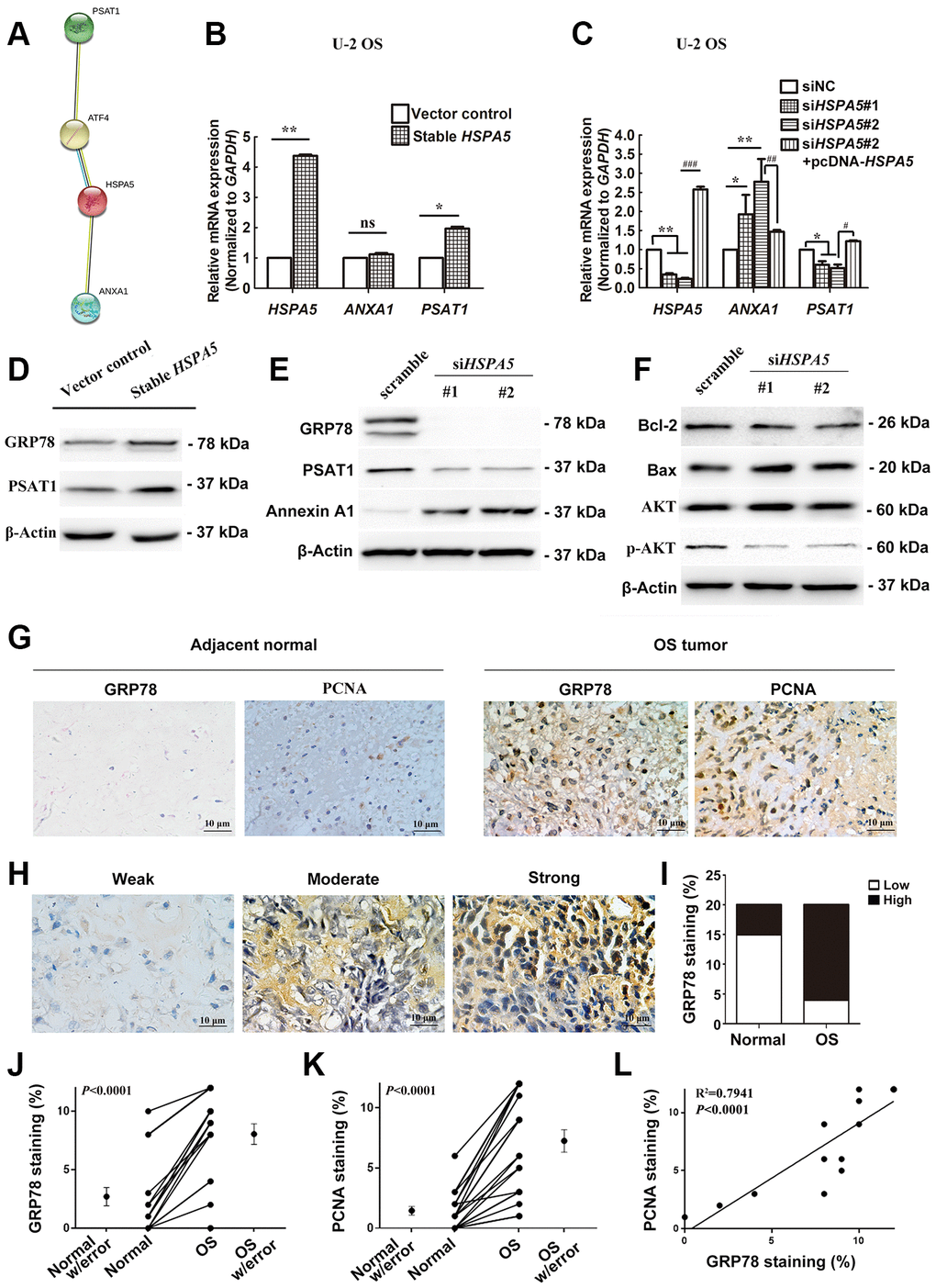 Our findings suggested an interplay between ANXA1, PSAT1 and HSPA5. STRING PPI analysis confirmed our hypothesis that GRP78 protein enabled to interacted with Annexin A1 or PSAT1 protein in a directly and indirectly manner, respectively (Figure 9A). In transcriptional level, we investigated in-vitro changes of the mRNA levels of ANXA1 and PSAT1 in stable HSPA5-expressing U-2 OS cells. The real-time PCR analysis showed the upregulation of PSAT1 mRNA level (Figure 9B). Similar result was observed in the transiently HSPA5-transfected cells (Supplementary Figure 5A). In turn, PSAT1 loss was detected when HSPA5 was compromised. However, HSPA5 inhibition dramatically increased ANXA1 transcriptional level while overexpression of which had no significant influence on ANXA1 (Figure 9C). To exclude the possible off-target for RNAi knockdown, we performed the rescue experiment where PSAT1 was downregulated while ANXA1 was increased in siHSPA5#2-treated U-2 OS cells when reconstruction of HSPA5 expression (Figure 9C). This suggests HSPA5 enabled to directly regulate the transcriptional level of PSAT1 and ANXA1. The present results indicate therapeutic intervention of HSPA5 can high-efficiently block the progression of OS through dual regulation of the key diagnostic and prognostic candidates ANXA1 and PSAT1. Similar to the transcriptional control, overexpression of GRP78 potentiated basic PSAT1 expression compared with the control (Figure 9D and Supplementary Figure 5B); GRP78 knockdown vice versa concurrently suppressed PSAT1 expression and upregulated Annexin A1 (Figure 9E). In addition, mitochondria play a central role in malignant tumor progression and BCL-2 family proteins were reported to be involved in mitochondria-related cell death [18]. We found the level of pro-survival protein Bcl-2 was significantly decreased, and the upregulation of proapoptotic protein Bax was observed when GRP78 was comprised. The activity of AKT signal was also impeded under such condition (Figure 9F).