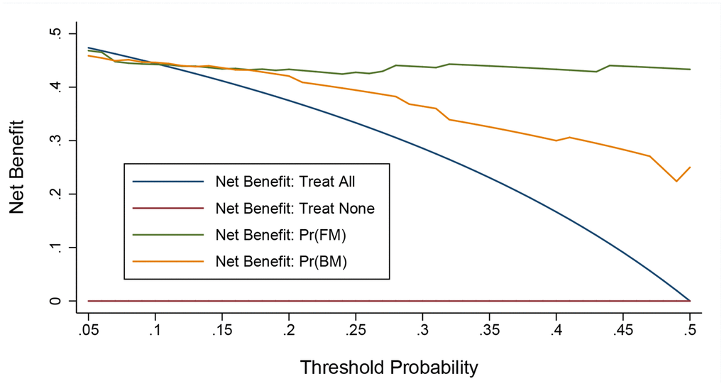 Before model construction on the basis of five independent significant factors, a wide range of statistics were calculated to assess prediction accuracy from both calibration and discrimination aspects (Table 3), as well as from the net benefits gained by adding the five factors to the basic model (Figure 1). Multi-aspect analyses revealed that the contribution of the five factors to predict the occurrence of severe or critical COVID-19 was statistically significant.