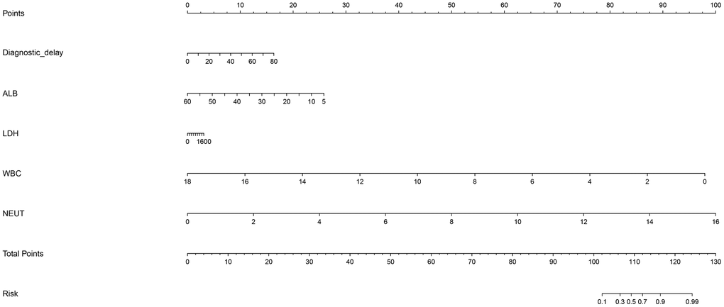 To further analyze the joint contribution of five independent significant factors, a prediction nomogram model was established, as shown in Figure 2. The maximal prediction capability reached as high as 99%, and calibration curve showed good prediction performance (Supplementary Figure 1), as reflected by the C-index (90.6%, p <0.001).