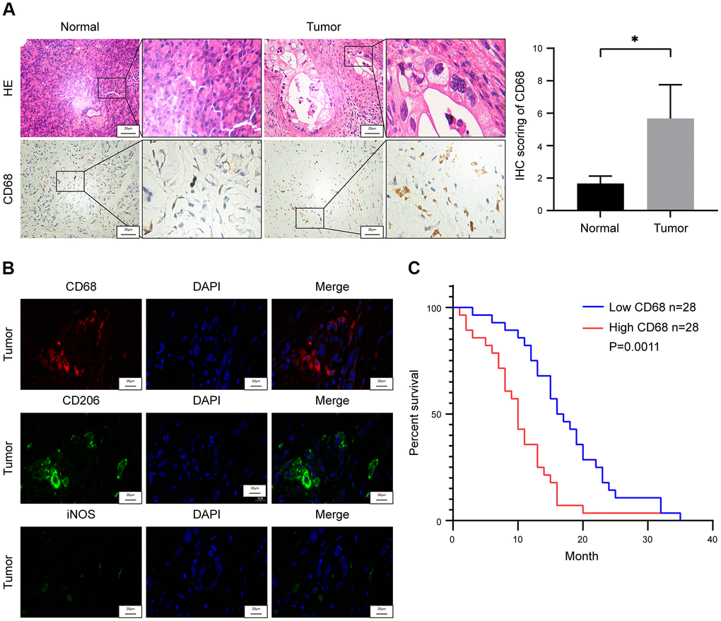 We evaluated the proportions of CD68+ TAMs in the PDAC tumor and adjacent normal pancreatic tissues (n=3) to determine TAM infiltration levels in human PDAC tissues and their correlation with survival outcomes. Immunohistochemical staining analysis showed significant enrichment of CD68+ TAMs in the PDAC tissues compared to the adjacent normal pancreatic tissues (Figure 1A). Macrophages are categorized into M1 and M2 subtypes that exhibit diverse functions in relation to tumor progression [21]. M2-type macrophages are immunosuppressive and are characterized by high expression of CD206, CD204 and ARG1, whereas, M1-type macrophages are pro-inflammatory and exhibit high expression of CD80, iNOS, and CD86 [19]. Most of the CD68+ macrophages in PDAC tissues were CD206 positive and showed weak iNOS expression (Figure 1B and Supplementary Figure 1). These results suggest that majority of the TAMs in the human PDAC samples belonged to immunosuppressive M2-phenotype.
