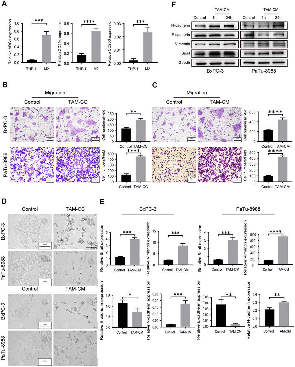 Previous evidence suggests that epithelial to mesenchymal transition (EMT) is a critical event that confers migration and invasion abilities to the tumor cells [22]. We observed EMT-related morphological changes which were more elongated and spindle-shaped in the BxPC-3 and PaTu-8988 cells when co-cultured with M2-type macrophages or cultured with TAM-CM-containing medium (Figure 2D). We then analyzed the expression of EMT markers in BxPC-3 and PaTu-8988 cells that were induced for 1 h or 24 h with TAM-CM. QRT-PCR and western blot analysis showed reduced mRNA and protein expression of E-cadherin, and increased mRNA and protein expression of N-cadherin and Vimentin in BxPC-3 and PaTu-8988 cells induced with TAM-CM (Figure 2E, 2F). Moreover, the mRNA and protein expression of Snail, a repressor of E-cadherin, was significantly upregulated in the BxPC-3 and PaTu-8988 cells induced with TAM-CM (Figure 2E, 2F). These results show that M2-type TAMs promote in vitro migration of PDAC cell lines by inducing EMT.