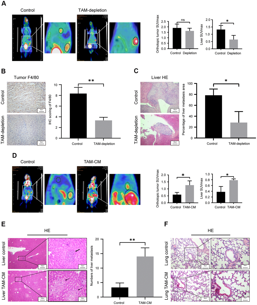 We then assessed the in vivo role of TAMs in PDAC metastasis. PET/CT scan analysis of TAM-depleted orthotopic PDAC model mice showed significantly higher liver metastasis in the control group compared to the TAM-depletion group (Figure 3A). TAM-depletion was confirmed by IHC staining with macrophage-specific anti-F4/80 antibody. Primary PDAC tissues of the TAM-depletion group showed significant depletion of TAMs compared to those from the control group (Figure 3B). H&E staining showed that liver metastasis significantly increased in the control group compared to the TAM-depletion group (Figure 3C).