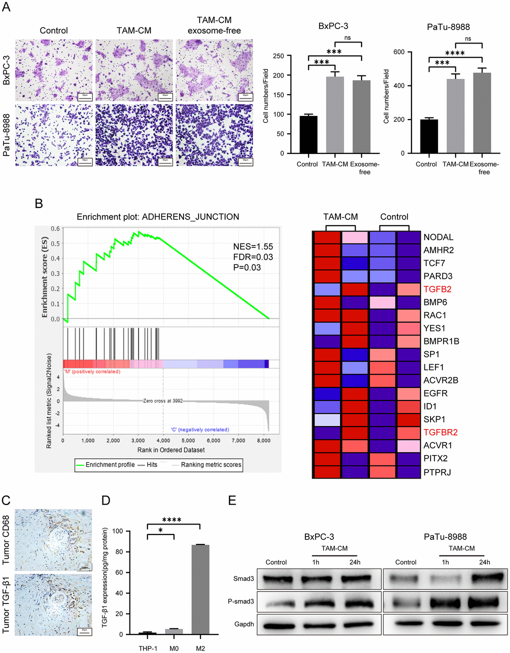 We then compared transcriptome profiles of the BxPC-3 and PaTu-8988 cells treated with TAM-CM or normal medium and identified 121 differentially expressed genes between the control and TAM-CM treatment groups (Supplementary Figure 3C). Gene set enrichment analysis (GSEA) of the differentially expressed genes showed enrichment of the “ADHERENS_JUNCTION” gene set including TGF-β and TGF-β receptors (Figure 4B). IHC analysis of PDAC tissue sections showed co-localization of CD68 and TGF-β1 (Figure 4C). ELISA assay showed that M2-type macrophages secreted significantly higher levels of TGF-β1 than the THP-1 and M0-type macrophages (Figure 4D). ELISA assays also showed that TAM-CM didn’t induce secretion of TGF-β1 from the PDAC cells (Supplementary Figure 3D). Western blot analysis showed significantly higher levels of phosphorylated Smad3 in BxPC-3 and PaTu-8988 cells incubated with TAM-CM compared to those incubated with normal medium without TAM-CM (Figure 4E). These data demonstrate that TAMs promote PDAC metastasis by secreting TGF-β and activating the TGF-β signaling pathway in PDAC cells.