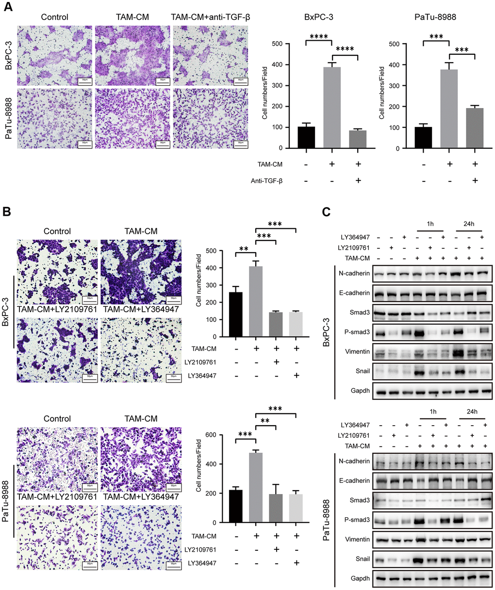 Next, we verified if activation of TGF-β signaling pathway enhanced migration ability of the PDAC cell lines. Transwell assays showed that migration and invasion of PDAC cell lines treated with TAM-CM and neutralizing anti-TGF-β antibody was significantly reduced compared to the PDAC cells treated with TAM-CM alone (Figure 5A and Supplementary Figure 4). Moreover, PDAC cell lines treated with TGF-β receptor inhibitors, LY2109761 and LY364947, in presence of TAM-CM showed decreased Transwell migration rates compared to BxPC-3 and PaTu-8988 cells treated with TAM-CM alone (Figure 5B). Previous studies demonstrate that the phospho-Smad2/3/4 complex promotes transcription of Snail and Zeb family members [23]. Western blot analyses showed that the TGF-β receptor inhibitors decreased the phosphorylation of Smad3 and Snail after TAM-CM treatment (Figure 5C). Furthermore, TGF-β receptor inhibition in TAM-CM treated PDAC cells decreased the levels of mesenchymal markers, Vimentin and N-cadherin, and increased the levels of epithelial marker, E-cadherin (Figure 5C). Taken together, these results demonstrate that inhibition of TGF-β signaling pathway attenuates induction of EMT in TAM-CM treated PDAC cells.