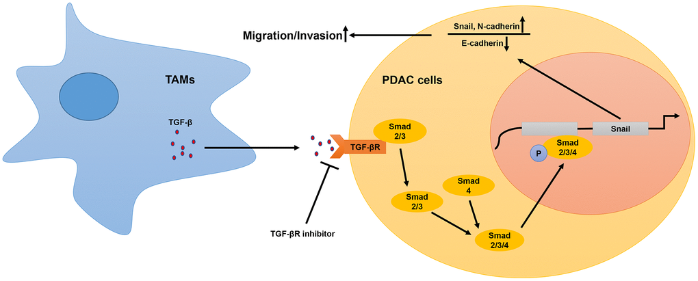 In conclusion, our study demonstrates that TAMs in the PDAC microenvironment promote metastasis by secreting TGF-β, which activates the downstream phospho-Smad2/3/4-Snail axis in PDAC cells. Snail upregulation induces EMT of the PDAC cells, thereby enhancing their metastatic and invasive properties. We also demonstrate that TGF-β signaling pathway inhibition abrogates enhanced migration ability of PDAC cells. Therefore, our study demonstrates that neutralizing TGF-β antibodies may be effective in improving survival outcomes of PDAC patients.
