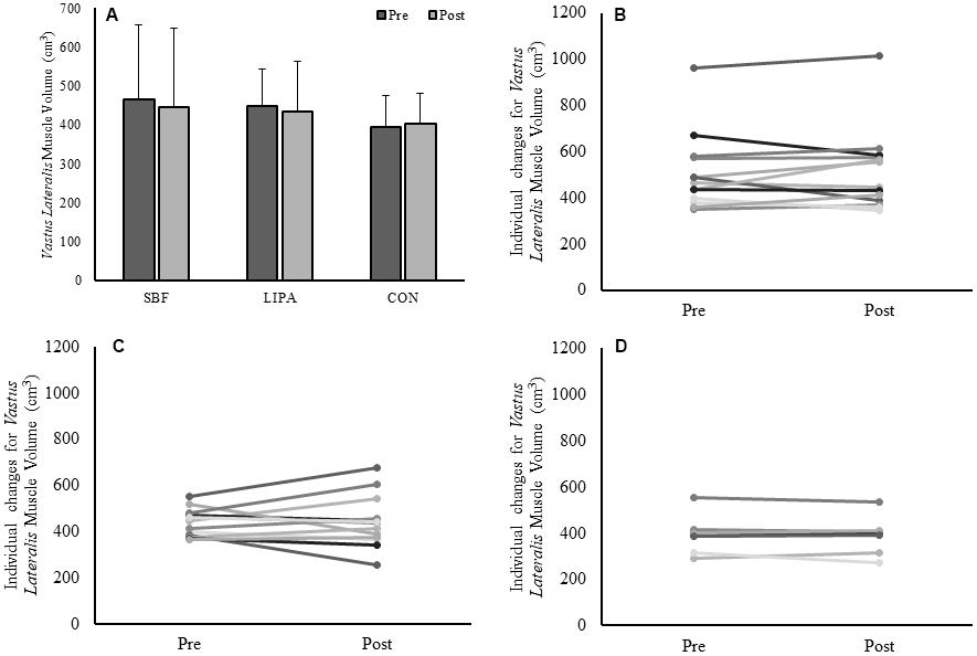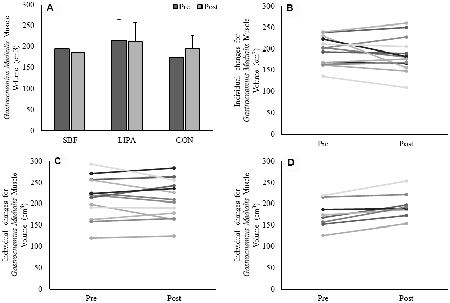 GM volume showed no effect of time (p=0.47), no effect of group (p=0.22) but a group×time interaction (p=0.014, β=0.77, ɳp2=0.24), with an increase in the control group GM volume being the driver for this interaction (Figure 1A). The associated changes for each group are illustrated in Figure 1B–1D. Similarly, a group×time interaction trend was observed for GM PCSA (p=0.06, β=0.56, ɳp2=0.18), with the control group increasing on average (15±12%) in contrast to both SBF (0±17%), and LIPA (-5±12%). However, there were no time, group, or group×time interactions observed for CSA, volume, or PCSA, in the GL and VL (Please see Table 2 and Figure 2).