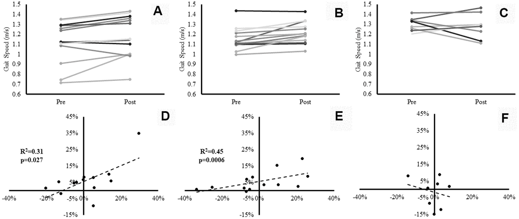Gait speed exhibited a significant main effect for time (p=0.003, ɳp2=0.36). Despite no significant group×time interaction effect (p=0.24), both SBF (0.06 ± 0.08m/s, 6±10%) (Please see Figure 3, Panel A), and LIPA (0.06 ± 0.07m/s, 6±6%) increased from pre to post (Please see Figure 3, Panel B), in contrast to control (-0.02 ± 0.12m/s, -2±9%) (Please see Figure 3, Panel C). However, no significant main effects were observed for postural balance ability.