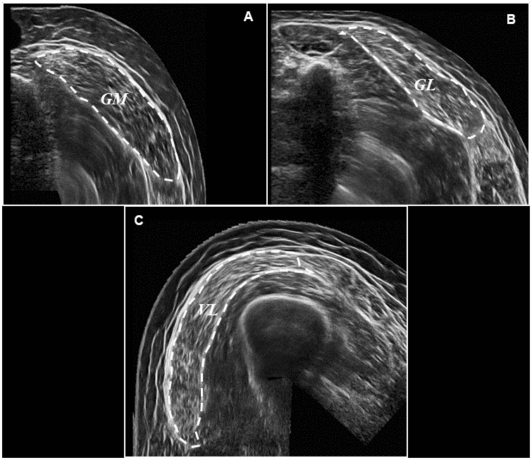 AT length was measured as the distance from the distal gastrocnemius myotendinous junction to the calcaneal insertion. Subsequently, AT CSA was obtained from representative transverse images (Depth: 30mm; Frequency: 27Hz; Focal Points: 1) at 0, 1, 2 and 3cm, of AT length. Offline ultrasound analysis was performed using IMAGEJ (1.45 s; National Institutes of Health, Bethesda, MD, USA) in a non-blind fashion. Determination of tendon CSA using this method has previously demonstrated good validity and reliability [92, 93]. Participants then switched to a supine position, with the knee fully extended and the hip angle raised to 45°, on top of a 30cm platform. The proximal and distal insertions of the VL were identified and 50% of VL length marked on the skin. Three more panoramic images of the VL head and thus VL CSA were then obtained as described previously (for representative image, please see figure 4C).. VL muscle architecture (FPA and Lf) was then determined, as previously described for the GM.