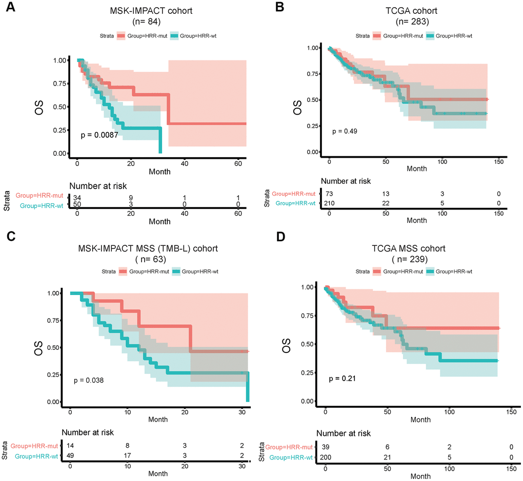 Finally, we explored the correlation between the HRR-mut status and the response to ICIs using an ICI-treated cohort (MSK-IMPACT cohort) [21] comprising 84 patients. The TCGA COAD cohort (non-ICI-treated) was used as a comparison cohort. In the MSK-IMPACT cohort, patients with HRR-mut COAD (n=34) had significantly better OS than patients with HRR-wt COAD (n=50) (log-rank P < 0.05; Figure 4A). Due to the lack of MSI status information in the MSK-IMPACT cohort, we elected to use the TMB-L population as a representative MSS subgroup for the survival analysis and found that the HRR-mut status was also significantly associated with a better prognosis for patients with TMB-L (MSS) COAD than for those with HRR-wt COAD (log-rank P < 0.05; Figure 4C). However, the correlation between HRR-mut status and OS was not significant in patients in the TCGA cohort with COAD/MSS COAD treated with traditional therapy (log-rank P > 0.05; Figure 4B–4D).