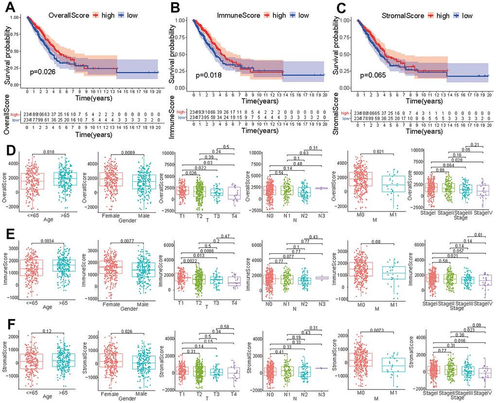 In order to identify the immune characteristics of the tumor microenvironment of LUAD and screen prognostic-related genes, an analysis process was established to show the screening process (Supplementary Figure 1). After analyzing the FPKM data from TCGA, we divided the immune and stromal cells in each sample into high-score and low-score groups. LUAD patients with a high overall score or immune score presented a longer survival time than did those with a low score (p<0.05) (Figure 1A, 1B). However, the survival time of patients with high stromal scores was not significantly different from that of patients with low stromal scores (p > 0.05) (Figure 1C). The overall score in tumor samples differed between ages < 65 and > 65 and varied by gender (Figure 1D). The overall score in T1 patients was different from that in obtained in T2, T3, and T4 patients, and the overall score in M0 patients was different from that in M1 patients (Figure 1D). Except for the significant difference in overall score observed between stage I and stage IV, there were no significant differences among other clinical stages (Figure 1D). The immune score in tumor samples was significantly different between ages < 65 and > 65 and varied by gender (Figure 1E). Immune scores in T1 patients were different from those in T2, T3, and T4 patients (Figure 1E). Except for the significant difference in immune score between stage I and stage III, there were no significant differences among other clinical stages (Figure 1E). The stromal score in tumor samples differed significantly between males and females and varied across different M stages (Figure 1F). Although the stromal score of stage IV patients was different from that of stage I and stage II patients, there were no significant differences among the other clinical stages (Figure 1F).