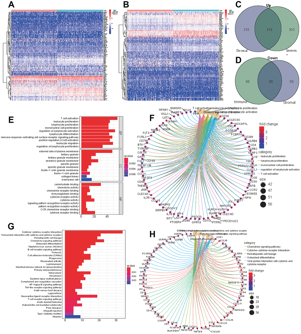 The samples were divided into a high immune (or stromal) score group and a low immune (or stromal) score group. A total of 623 upregulated genes and 142 downregulated genes were screened from the high immune score group, and 673 upregulated genes and 112 downregulated genes were screened from high stromal score group (Figure 2A, 2B). We obtained 318 upregulated genes and 56 downregulated genes by taking the intersection of the DEGs in the two groups (Figure 2C, 2D). All 374 DEGs were further employed to conduct GO (Figure 2E, 2F) and KEGG (Figure 2G, 2H) enrichment analyses to elucidate their functions in tumorigenesis and progression. T cell activation, leukocyte proliferation and lymphocyte proliferation were the most enriched pathways, and most genes were related to immune- or stromal- cell activation and proliferation. These TME-related genes and cells are the primary causes of tumor growth and deterioration.