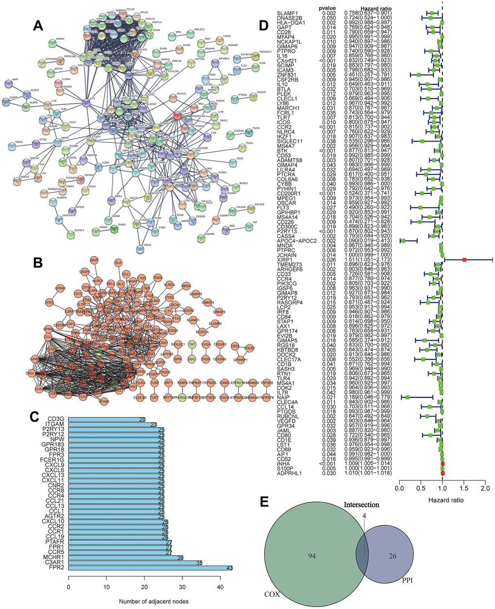 To research interactions between the transcription products of these DEGs, we built the PPI network using Cytoscape software and the Search Tool for the Retrieval of Interacting Genes/Proteins (STRING) database. At the same time, Univariate Cox regression analysis was conducted on DEGs to identify 124 candidate prognostic genes with p-values less than 0.05. The most important four target genes (CCR2, CCR4, P2RY12, and P2RY13) were identified by taking the intersection of the top 30 genes with the most nodes and 98 candidate prognostic genes.