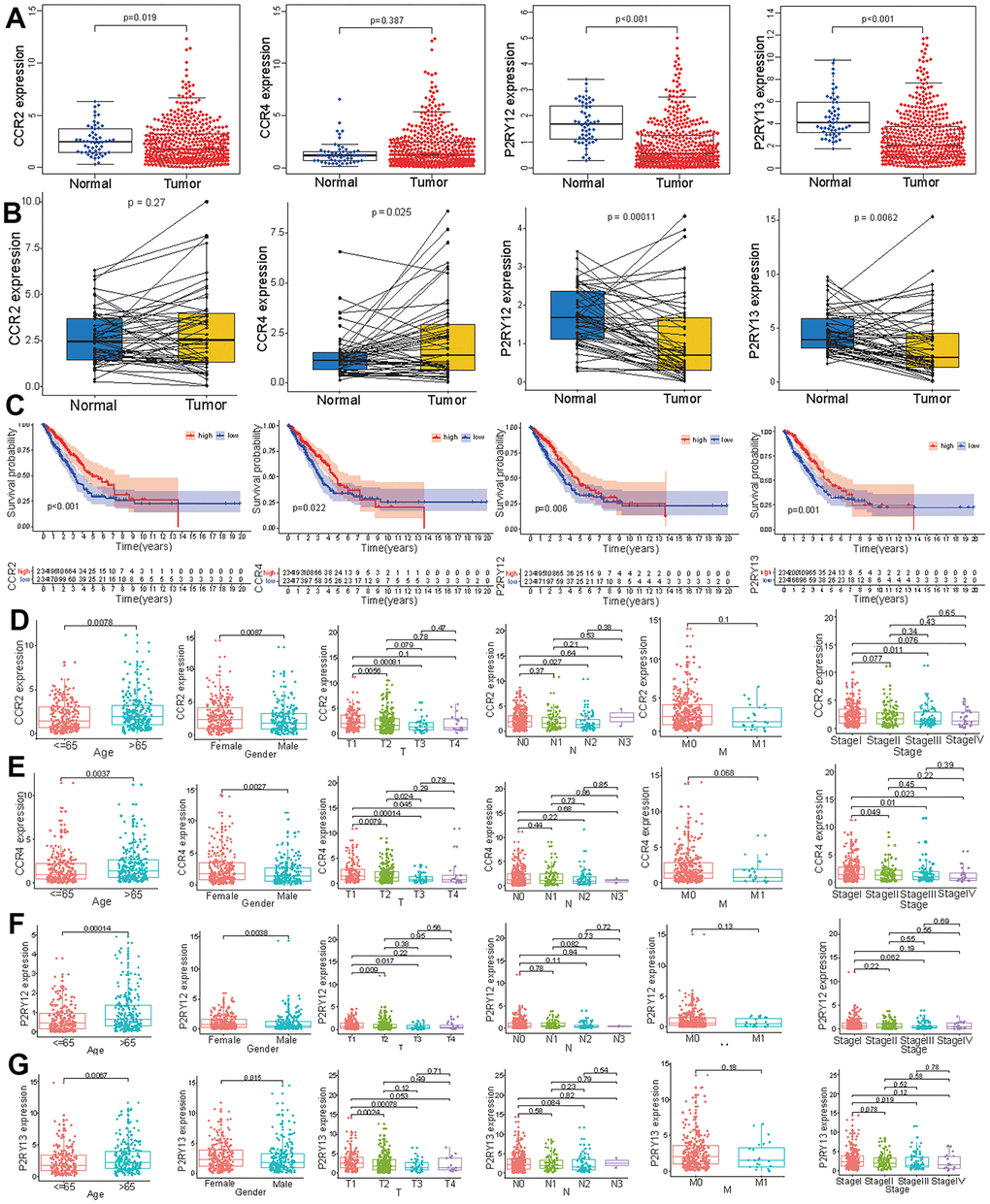 Difference analysis of the four genes (CCR2, CCR4, P2RY12, and P2RY13) was performed using the R packages “limma” and “ggpubr”. Survival analysis of these four genes was conducted using the R packages “survival” and “survminer”. The survival curve was plotted using the Kaplan-Meier method, and log rank was used as a significance test.