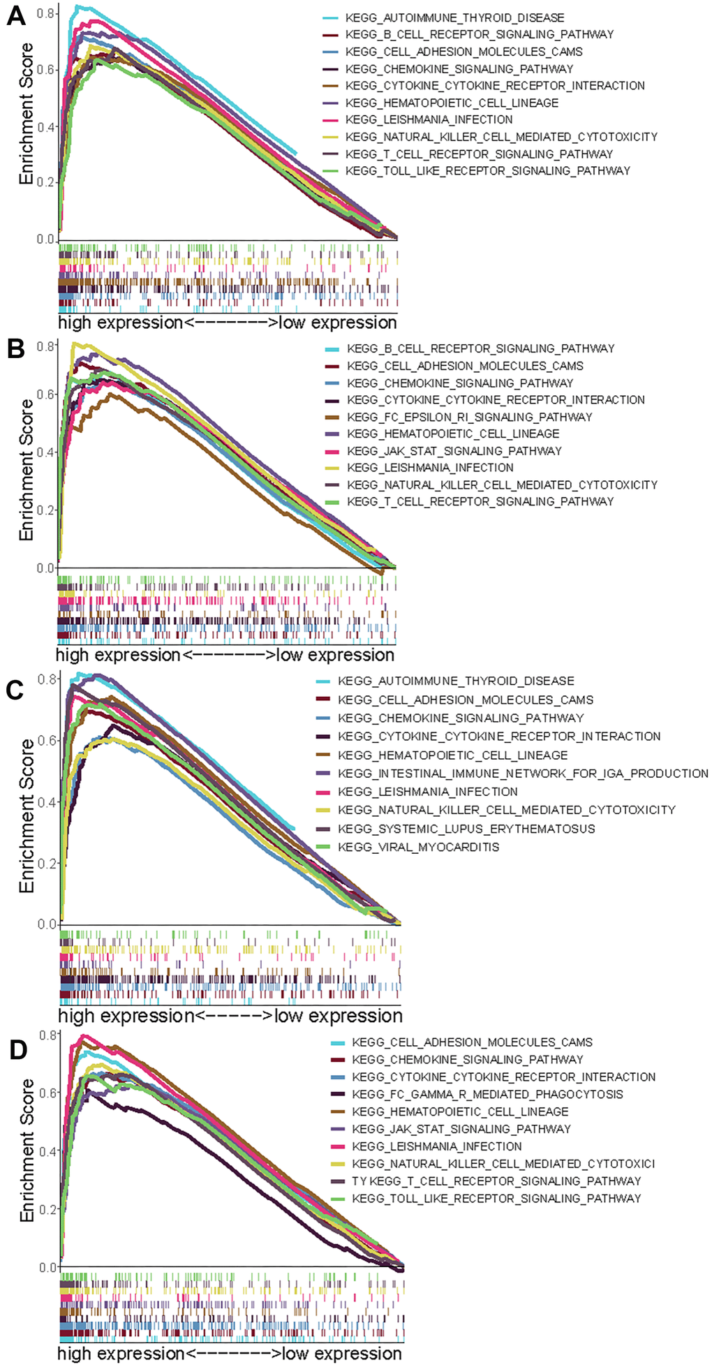 To research signaling pathways related to these four genes (CCR2, CCR4, P2RY12, and P2RY13), gene set enrichment analysis (GSEA) was performed to select significantly enriched signaling pathways according to NES, nominal p-value, FDR q-value and FWER p-value. The 10 most important signaling pathways enriched in highly expressed phenotypes of CCR2 were autoimmune disease, B cell receptor signaling pathway, cell adhesion molecules, chemokine signaling pathway, cytokine- cytokine interaction, hematopoietic cell lineage, Leishmania infection, NK cell-mediated cytotoxicity, T cell signaling pathway, and Toll-like receptor signaling pathway (Figure 5A). The 10 most important signaling pathways enriched in highly expressed phenotypes of CCR4 were the B cell receptor signaling pathway, cell adhesion molecules, cytokine- cytokine interaction, Fc epsilon RI signaling pathway, hematopoietic cell lineage, JAK-STAT signaling pathway, Leishmania infection, NK cell-mediated cytotoxicity, and T cell receptor signaling pathway (Figure 5B). The 10 most important signaling pathways enriched in highly expressed phenotypes of P2RY12 were autoimmune disease, cell adhesion molecules, chemokine signaling pathway, cytokine- cytokine interaction, hematopoietic cell lineage, intestinal immune network for IgA production, Leishmania infection, NK cell-mediated cytotoxicity, systemic lupus erythematosus, and viral myocarditis (Figure 5C). The 10 most important signaling pathways enriched in highly expressed phenotypes of P2RY13 were cell adhesion molecules, chemokine signaling pathway, cytokine- cytokine interaction, FcγR -mediated phagocytosis, hematopoietic cell lineage, JAK-STAT signaling pathway, Leishmania infection, NK cell-mediated cytotoxicity, T cell receptor signaling, and toll like receptor signaling pathway (Figure 5D).
