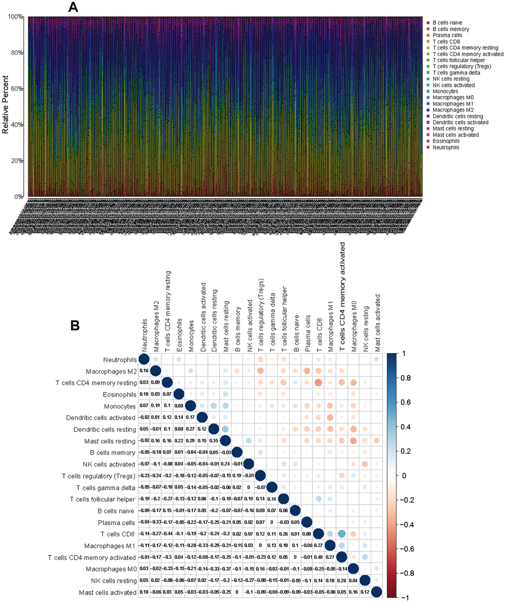 To characterize the role played by immune cells in the progression of LUAD, the CIBERSORT algorithm was employed to estimate the differences in immune infiltration of 22 immune cell types in the TME. Figure 6A shows the landscape of the TME immune infiltration model, and every bar plot represents the proportion of 22 immune cells in each sample. Furthermore, the correlation matrix reflected the correlation of different TIICs, ranging from weak to strong, in LUAD (Figure 6B). As shown in the above analysis, CD4 memory resting T cells and CD8 T cells had a strong negative correlation (Cor = -0.44). CD8 T cells exhibited a positive correlation with CD4 memory activated T cells (Cor = 0.48).