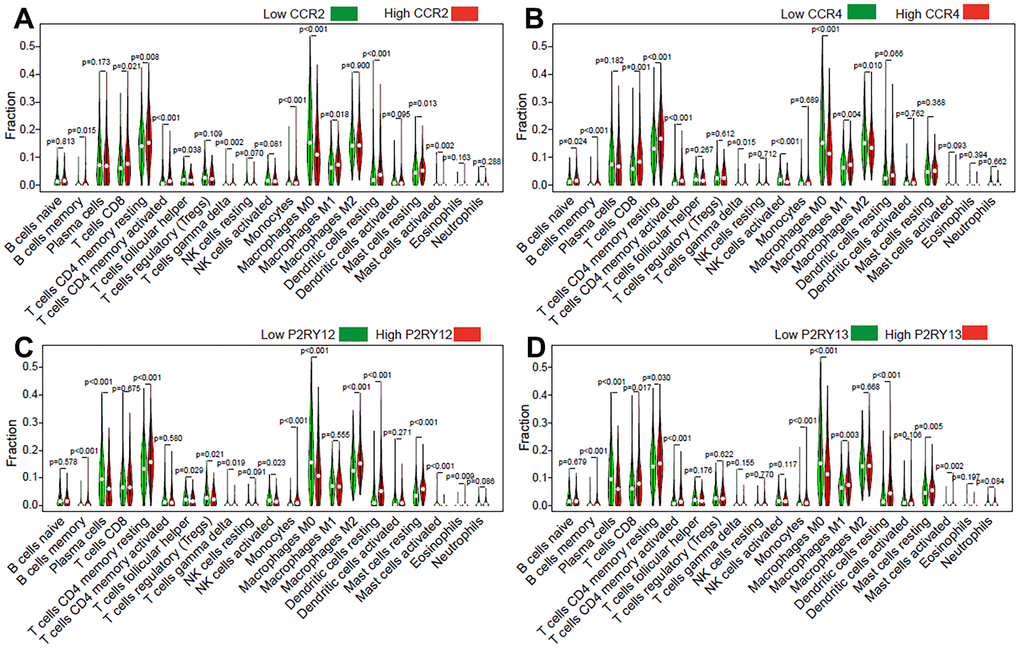 The expression levels of these four genes were closely related to the infiltration of immune cells and the activation or dormancy of immune signaling pathways. We identified the 10 most important signaling pathways enriched in the highly expressed phenotypes of each gene. In addition, we found that the CCR2 expression level was closely related to M0 macrophages, CD4 memory activated T cells, and dendritic cell resting cells. The CCR4 expression level was closely related to memory B cells, CD4 memory resting T cells, and M0 macrophages. The P2RY12 expression level was closely related to dendritic cell resting cells, monocytes, and CD4 memory resting T cells. P2RY13 expression levels were closely related to dendritic cell resting cells, plasma cells, and M0 macrophages. The relative abundances of memory B cells, CD4 memory resting T cells, and M0 macrophages were jointly regulated by these four genes.
