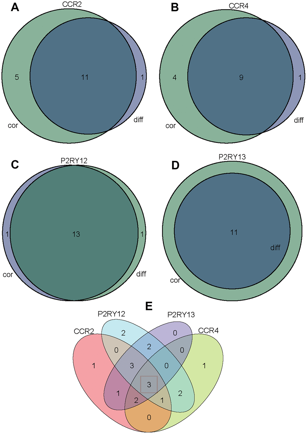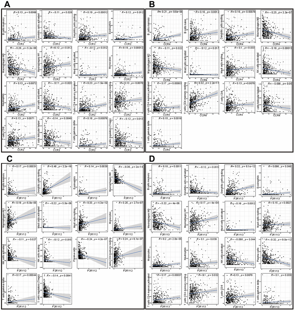 To further study the relationships among the four genes (CCR2, CCR4, P2RY12, and P2RY13) and immune cell infiltration, we investigated the correlations of the expression of these four genes with TIICs. The TIICs correlated with these four genes are presented in Figure 8. The results indicated that CCR2 was positively correlated with the infiltration of memory B cells, resting dendritic cells, eosinophils, M1 macrophages, monocytes, neutrophils, CD4 memory activated T cells, CD4 memory resting T cells, CD8 T cells, and gamma delta T cells but negatively correlated with the infiltration of activated dendritic cells, M0 macrophages, activated mast cells, activated NK cells, follicular helper T cells, and regulatory T cells (Figure 8A). CCR4 was positively correlated with the infiltration of memory B cells, naive B cells, resting dendritic cells, resting mast cells, CD4 memory activated T cells, CD4 memory resting T cells, and CD8 T cells but was negatively correlated with the infiltration of M0 macrophages, M2 macrophages, activated mast cells, activated NK cells, and follicular helper T cells (Figure 8B). P2RY12 was positively correlated with the infiltration of memory B cells, resting dendritic cells, eosinophils, M2 macrophages, resting mast cells, monocytes, CD4 memory resting T cells, and gamma delta T cells but was negatively correlated with the infiltration of M0 macrophages, activated mast cells, activated NK cells, resting NK cells, plasma cells, and regulatory T cells (Figure 8C). P2RY13 was positively correlated with the infiltration of memory B cells, resting dendritic cells, eosinophils, M1 macrophages, resting mast cells, monocytes, neutrophils, CD4 memory activated T cells, CD4 memory resting T cells, CD8 T cells, and gamma delta T cells but was negatively correlated with the infiltration of activated dendritic cells, M0 macrophages, activated mast cells, activated NK cells, and plasma cells (Figure 8D).