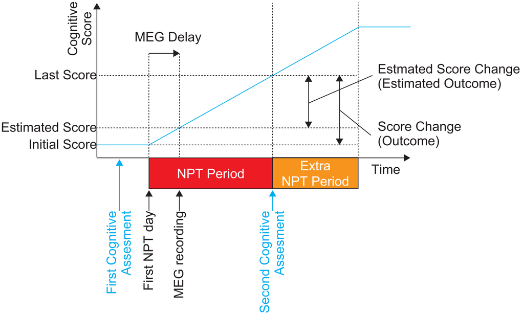 Two cognitive instruments were used to evaluate participant cognitive performance: the MMSE-J [28, 62] and the ADAS-J Cog [29, 63–65]. Lower MMSE-J scores and higher ADAS-J Cog scores indicate more severe cognitive impairment. Both types of cognitive assessments (MMSE-J and ADAS-J Cog) were conducted once at the beginning and at the end of the NPT period. The first day of NPT period was defined as the day when participants underwent the NPT for the first time (Figure 1). The initial assessments were made before the first day of the NPT period (MMSE-J: 16.1 ± 11.4 days, ranging from 5 to 42 days; ADAS-J Cog: 8.7 ± 2.9 days, ranging from 5 to 14 days), and the corresponding scores were defined as ‘Initial Scores’. A few months after the first day of NPT, the second set of MMSE-J and ADAS-J Cog assessments were performed on the same day, with the corresponding scores being defined as ‘Last Scores’. The ‘Score Change’ (‘Outcome’) was defined as the difference between the ‘Initial Scores’ and the ‘Last Scores’ for each assessment. In the present study, the ‘NPT period’ was defined as the period beginning from the first day of NPT to the day of the second cognitive assessment (i.e. the day on which ‘Last Scores were provided). NPT after the second assessment (i.e. the ‘Extra NPT period’ in Figure 1) was ignored. The length of the NPT period was 184.6 ± 33.4 days (mean ± SD, ranging from 126 to 245 days). Resting-state brain activity was recorded for each participant during the NPT period as early as possible. Because there was a considerable delay (34.3 ± 25.7 days, ranging from 0 to 76 days) between the day on which the ‘Initial Scores’ were measured and the day of the MEG recording (i.e. ‘MEG delay’ in Figure 1), we estimated cognitive scores at the MEG recording day using a liner model; these were defined as the ‘Estimated Scores’ (Figure 1). In this model, we hypothesised that: (i) the scores did not change between the day on which the ‘Initial Score’ was measured and the first day of NPT, and (ii) the scores changed (i.e. improved or worsened) linearly in the NPT period between the first and the last day of NPT. The second hypothesis was supported by a previous study, which showed that the longer the NPT period, the better the outcome [30]. The difference between ‘Estimated Score’ and ‘Last Score’ was defined as the ‘Estimated Score Change’ (‘Estimated Outcome’); it represented the outcome after MEG recording. Two of the 16 participants underwent the MEG scan before the first day of NPT; in this case, the participant’s ‘Estimated Score’ was considered the same as the ‘Initial Score’. Eleven of the remaining 15 participants underwent MEG scans before completing 30% of their NPT period, whereas MEG acquisitions for the rest of the participants were carried out later.