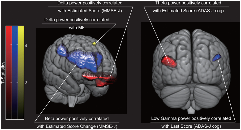 Regional oscillatory intensity at each frequency band was compared with cognitive scores in three ways: (i) with scores on the recording day (‘Estimated Scores’); (ii) with estimated changes in scores (‘Estimated Score Change’); and (iii) with scores at the end of the NPT period (‘Last Scores’). The MMSE-J ‘Estimated Score’ was positively correlated with delta intensity at the left anterior and right medial orbital gyrus, whereas the ADAS-J Cog ‘Estimated Score’ was positively correlated with theta intensity at the left angular gyrus (Table 1 and Figure 2). The MMSE-J ‘Estimated Score Change’ was positively correlated with the beta intensity at the right superior frontal gyrus medial segment, opercular part of the inferior frontal gyrus, triangular part of the inferior frontal gyrus, and post central gyrus. The ADAS-J Cog ‘Estimated Score Change’ score was not significantly correlated with oscillatory intensity. Finally, the ADAS-J Cog ‘Last Score’ was positively correlated with low-gamma intensity at the right angular gyrus. No other correlation was found.