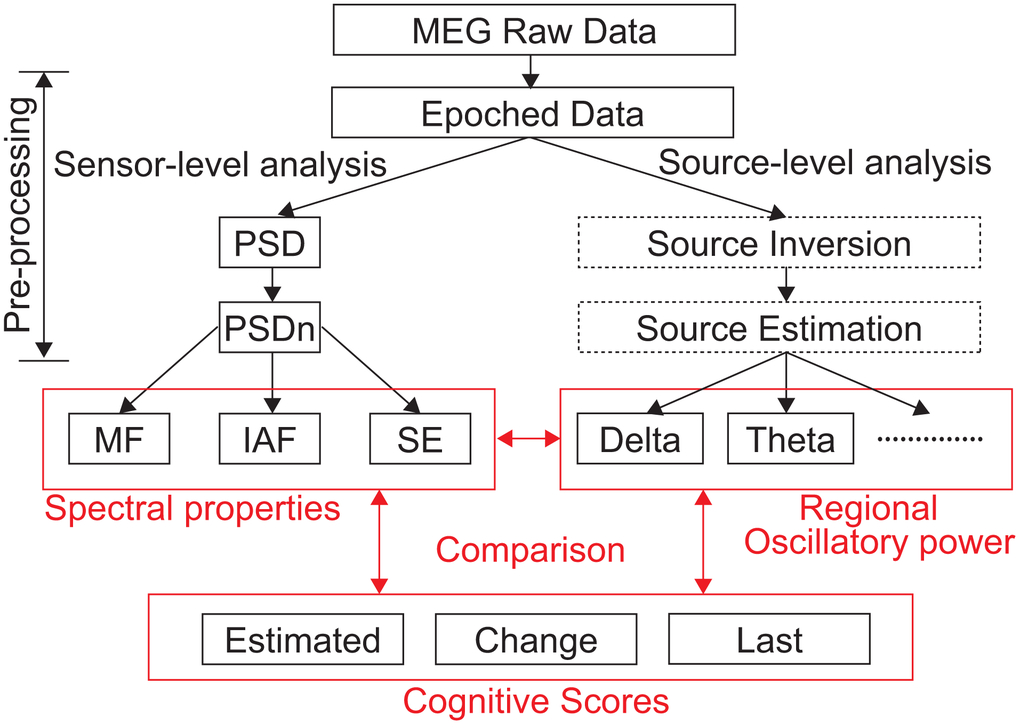 MEG data were pre-processed offline using the software package SPM-12 (Wellcome Trust Centre for Neuroimaging, London, UK; https://www.fil.ion.ucl.ac.uk/spm/) and the MEAW system (https://www.hokuto7.or.jp/hospital/lang/english-home/meaw/). Two types of standard MEG analyses were applied: sensor-level and source-level analyses (Figure 3). Each of them has some advantages and drawbacks. The sensor-level results are mathematically reliable and are useful for identifying three types of neural changes: (i) enhanced low frequency oscillatory activity accompanied by attenuated high frequency oscillatory activity, (ii) slowing down of the alpha peak frequency, and (iii) less prominent alpha oscillations. It is advantageous to find global changes rather than regional ones; however, biological/medical interpretations are difficult due to lack of accurate information about brain regions. In this regard, source-level analysis has rich biological/medical implications because it provides regional information about the brain. The potential of this kind of analysis to predict the NPT outcome was demonstrated in our previous work in which we reported its sensitivity to detect subtle changes in oscillatory neural activity due to NPTs [14]. Nonetheless, source-level results can be unstable (i.e. algorithm-dependent) and less sensitive to changes with large inter-individual differences at the regional level. Therefore, we applied both approaches (i.e. sensor- and source-level analyses) to obtain an accurate and thorough characterisation of the neural changes associated with NPT.