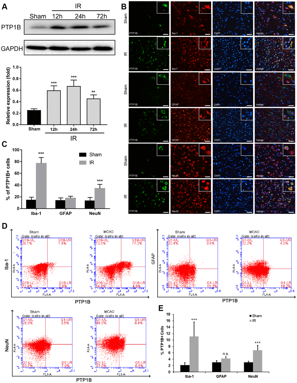 To investigate the cell distribution of PTP1B expression after IR injury, double immunofluorescence was applied using antibodies targeting Iba-1, GFAP, and NeuN to identify microglia, astrocytes, and neurons, respectively. The ratio of Iba-1(+)/PTP1B(+), GFAP(+)/PTP1B(+), and NeuN(+)/PTP1B(+) double-positive cells was calculated based on random fields under a laser confocal microscope. PTP1B was expressed in microglia, neurons, and astrocytes in the sham cerebral cortex (Figure 1B). Twenty-four hours after cerebral IR injury, the number of PTP1B-positive cells was significantly increased in microglia and neurons, but not astrocytes, and this augmentation in the percentage of PTP1B-positive cells was more dramatic in microglia compared with neurons (Figure 1C).
